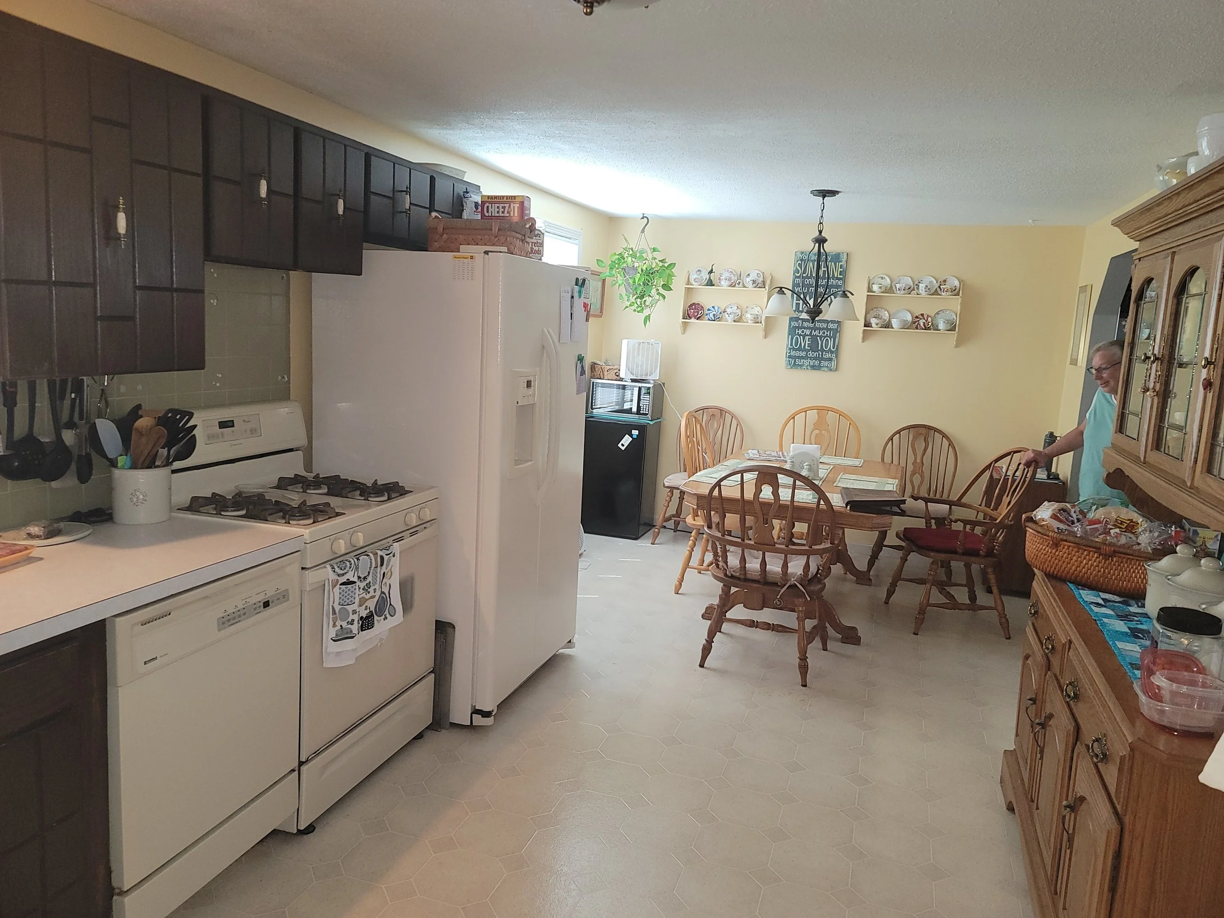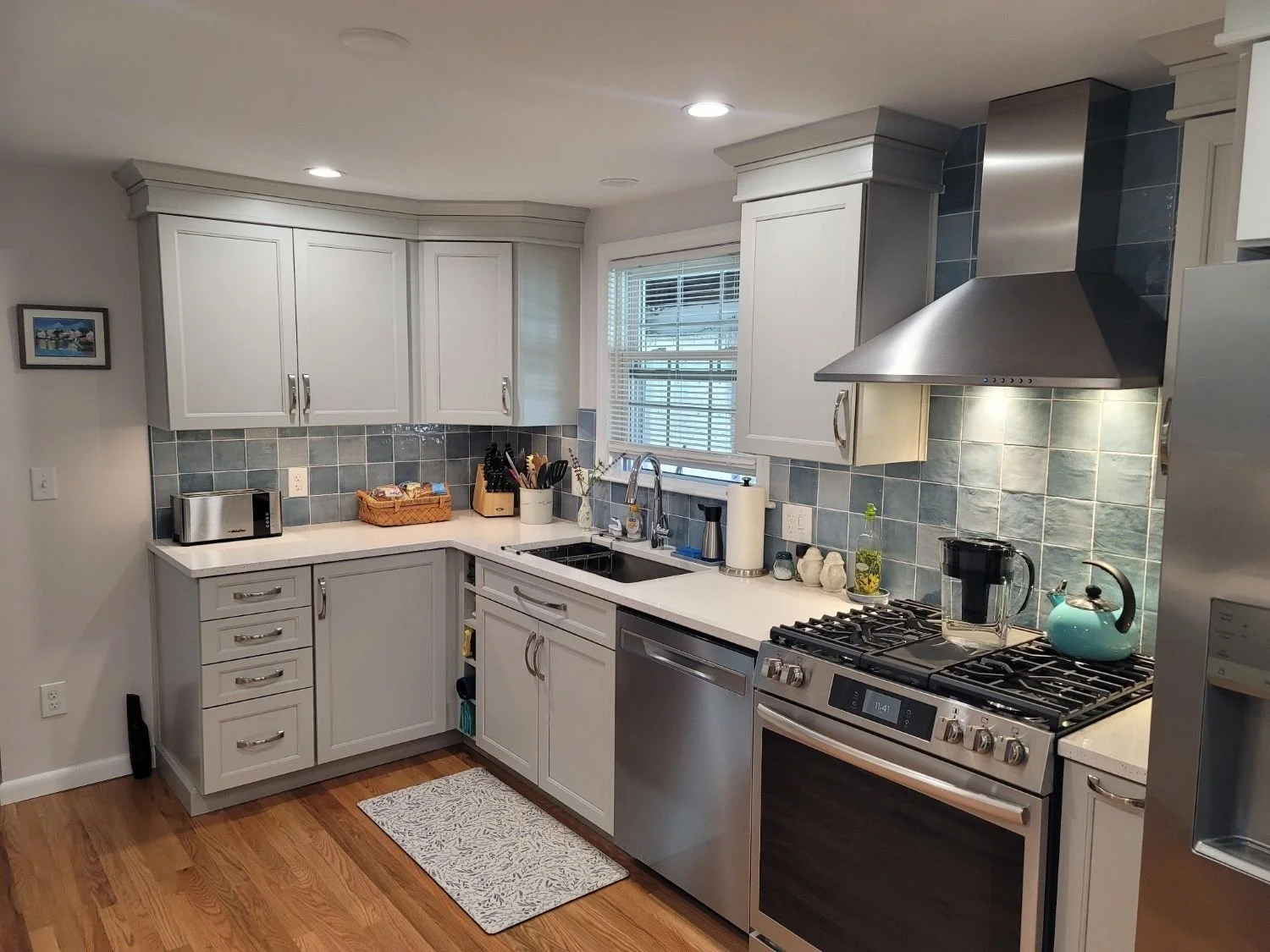 The first-floor bathroom underwent a full renovation featuring a 24-inch Nantucket white shaker vanity with a coordinating mirror and top, paired with stacked Waypoint 9x36-inch white shaker cabinets for added storage. Matte black pulls complement the cabinetry and coordinate with the Delta Arvo widespread vanity faucet and Delta Arvo shower system, which includes a handheld sprayer and valve. The shower area features an Ove Decors Erika shower base and a Misty six-panel alcove wall kit for a sleek, clean finish. A Panasonic Whisper EZ fan with integrated lighting was installed for ventilation, properly vented to the exterior. Over the vanity, a Capital Lighting Lawson 2 Light 14" wide vanity light adds elegant illumination. Additional features include a comfort height American Standard Cadet 3 toilet, Delta Trinsic towel ring and tissue holder, a curved Moen Triva shower curtain rod, and a Sure-Loc robe hook. The walls were painted in the client’s chosen Benjamin Moore color, with trim and ceiling in Chantilly Lace for a fresh, modern look. The floor was finished with 7x48-inch MSI luxury vinyl plank flooring and a coordinating transition threshold.