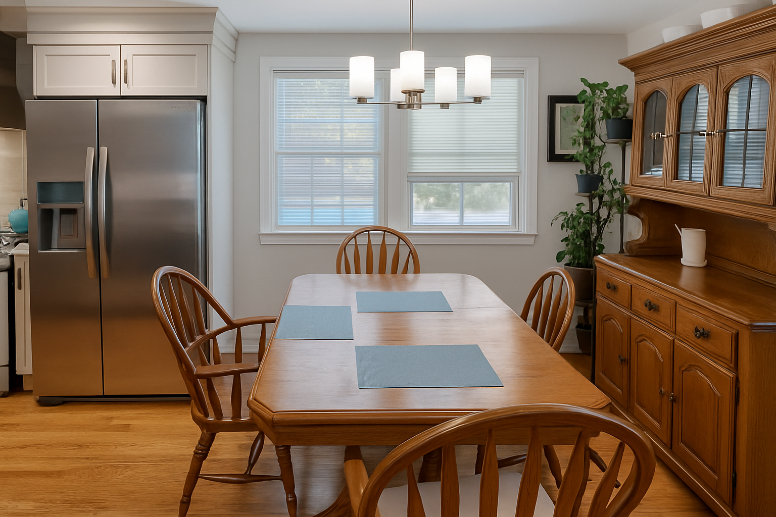 Maxim Dart 5-Light chandelier, above the dining room table and dual windows bringing in natural light.