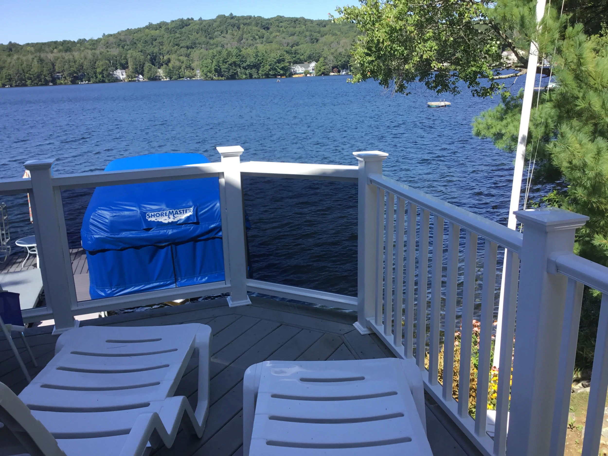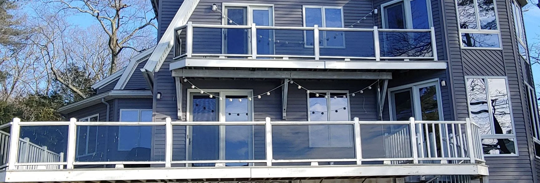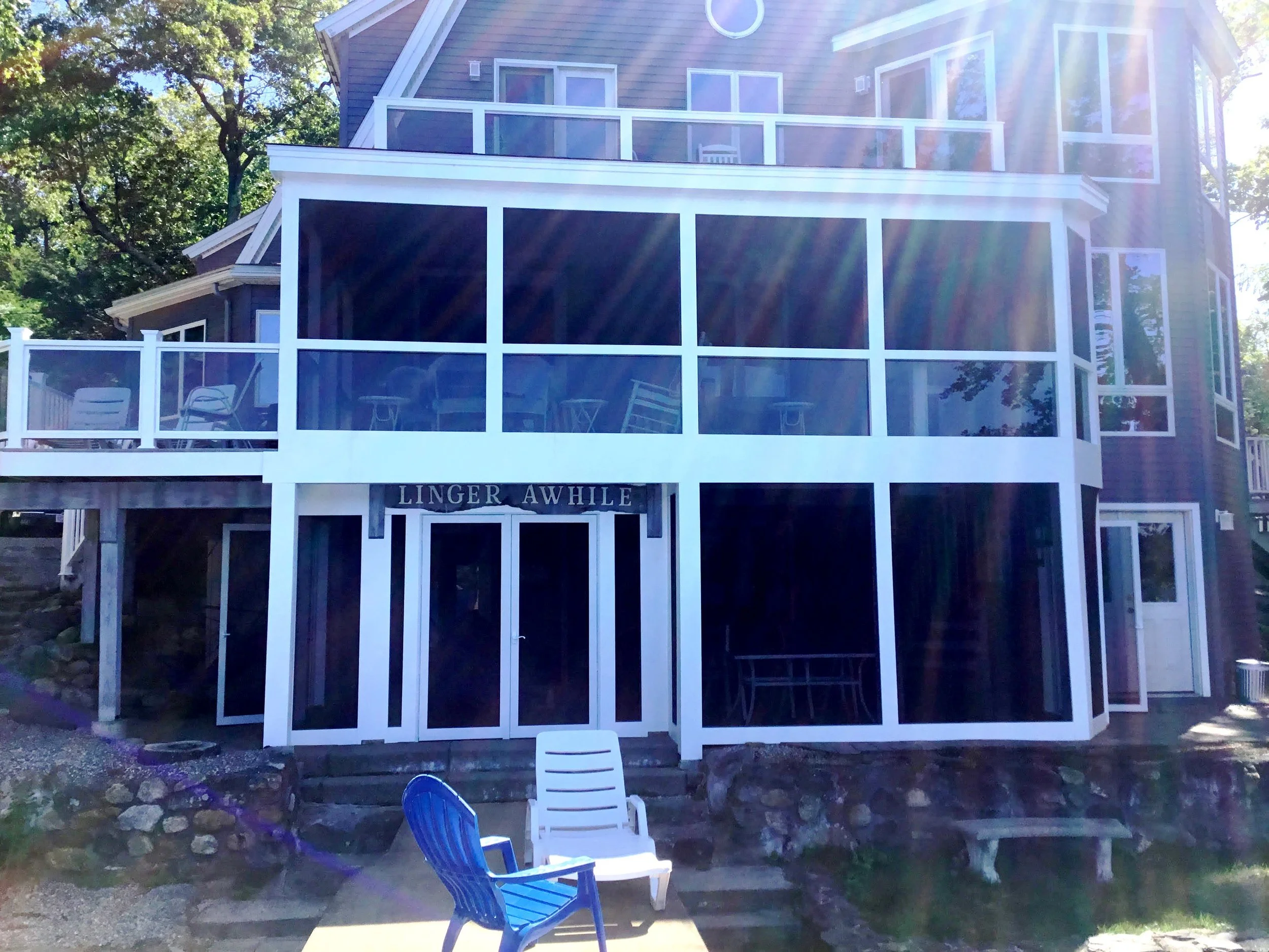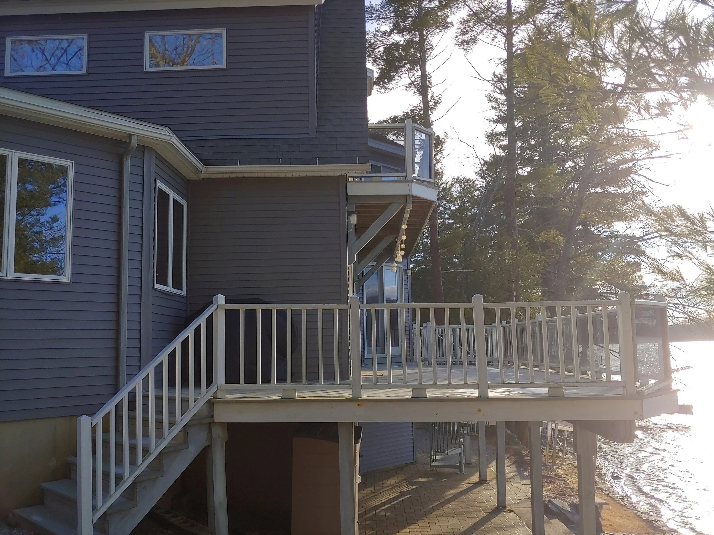 CORE Remodeling Services added a three-season screen and glass panel room to this great house on Big Alum Pond/Lake. Deck was rebuilt with all new pressure treated supports to accommodate a new roof with balcony style Trex composite deck with white composite railings with New England style post caps on the roof off the master bedroom overlooking the lake. We used 9/16” tempered grey tinted laminated glass panels for the upper level deck and lower level of the screen room to allow perfect views of the great scenery of the lake. We also enclosed the lower level patio to provide a great space for hanging rocking chairs and more space to enjoy the great outdoors, with no bugs. Replaced old railings leading to the spiral staircase with new composite railings. Ceilings were finished with vinyl bead board ceilings with ceiling fans. All exposed wood was wrapped in white composite materials to make this a maintenance free space. The final touch from CORE to make the project complete, was to hang the family sign naming their home so they can enjoy and “linger awhile”.