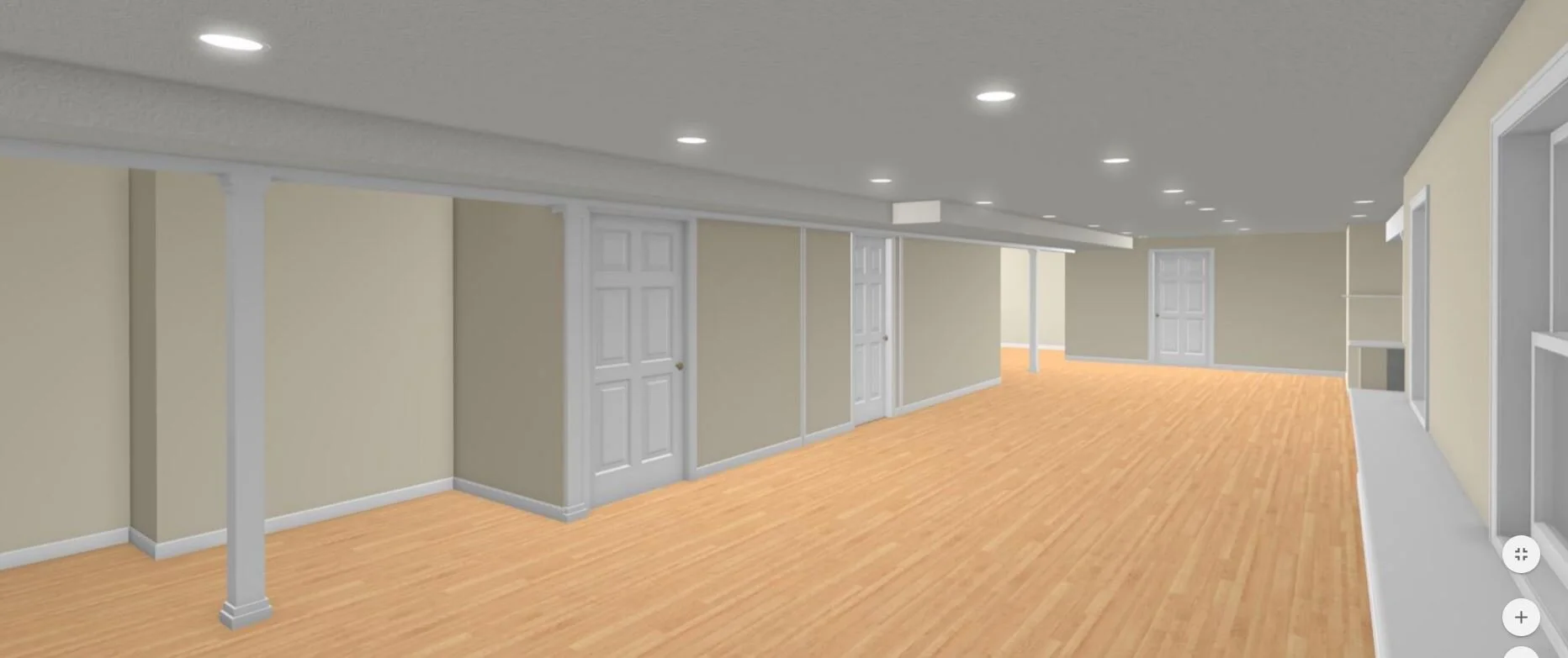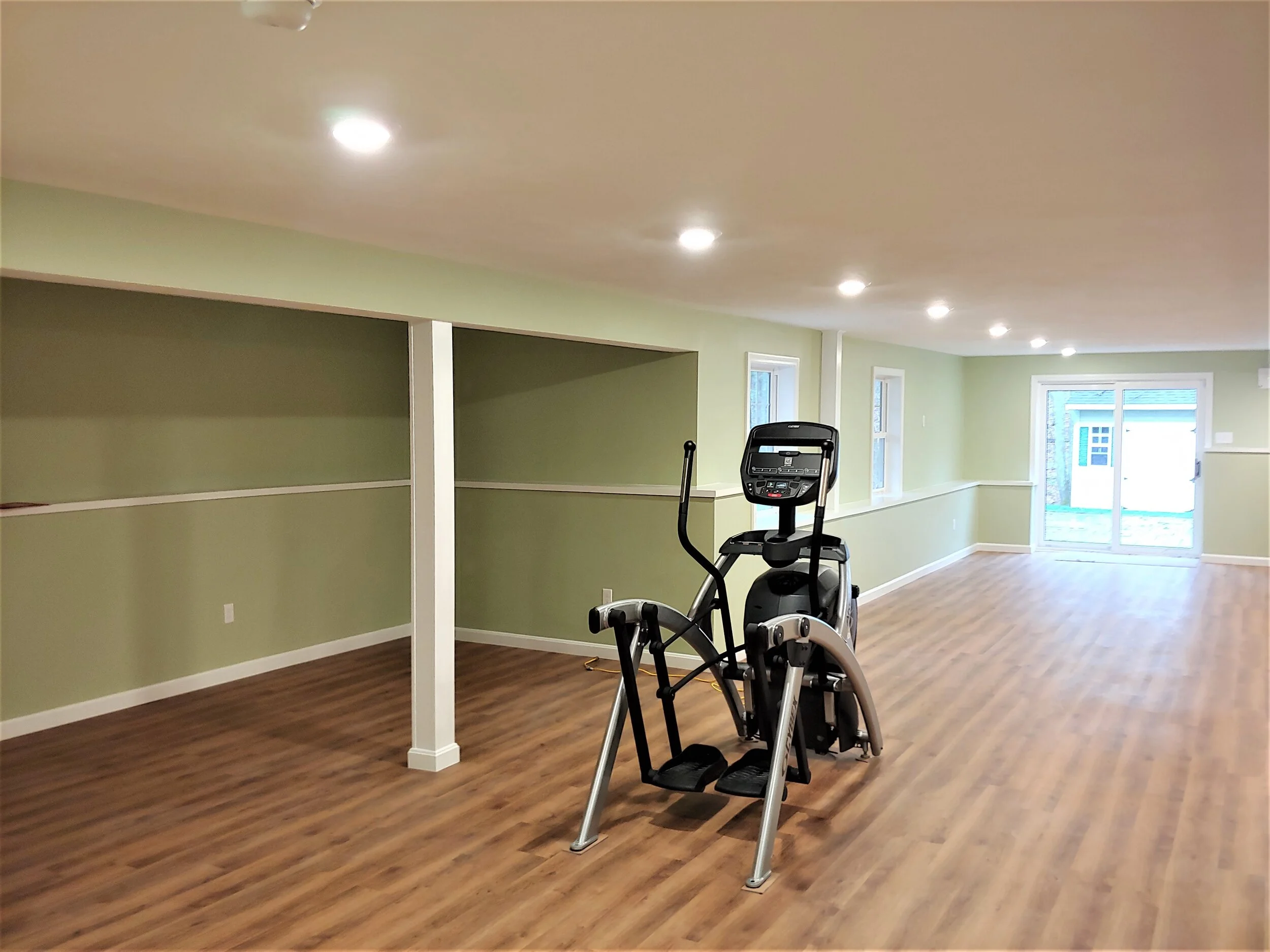 The entire basement floor was finished with Phoenix Momentum luxury vinyl flooring in the color Harvest, chosen for its durability and wood-inspired aesthetic. The ceiling was completed with recessed lighting, bringing a clean and modern touch to the new living area.