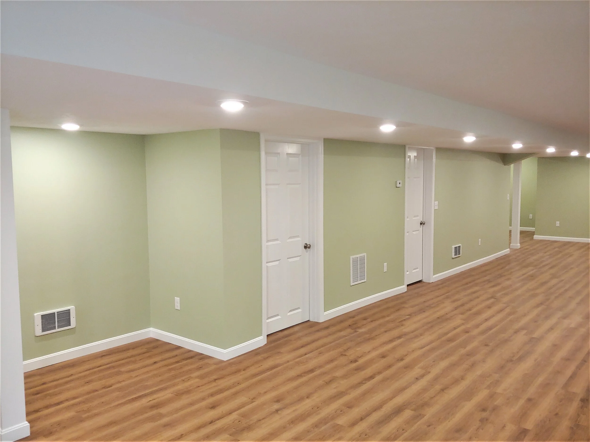 This Westborough, MA basement renovation by CORE Remodeling Services transformed an unfinished lower level into a warm, inviting living space — tailored through a detailed 3D floor plan design. We framed both the interior and exterior foundation walls to create a comfortable family room, a half bathroom, and a dedicated storage room under the stairway.