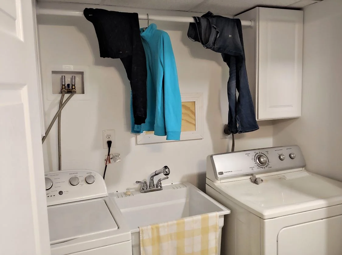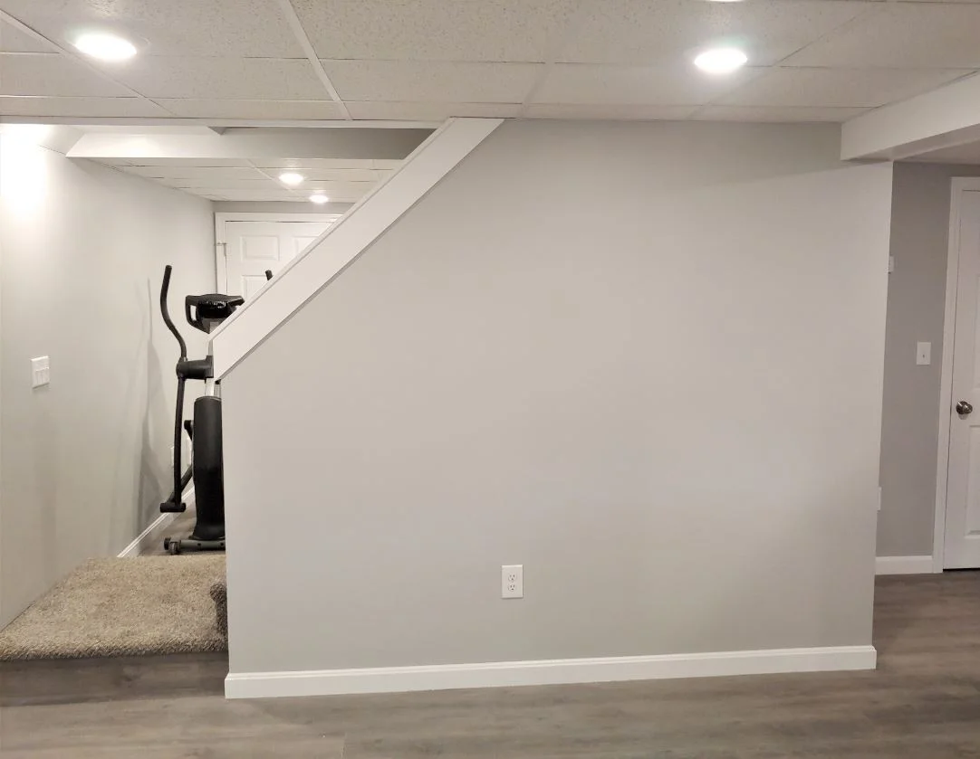This finished basement renovation in Webster, MA transformed an underutilized space into a fully functional lower level complete with a custom bar, full bathroom with a walk-in shower, dedicated laundry room, and an exercise area.