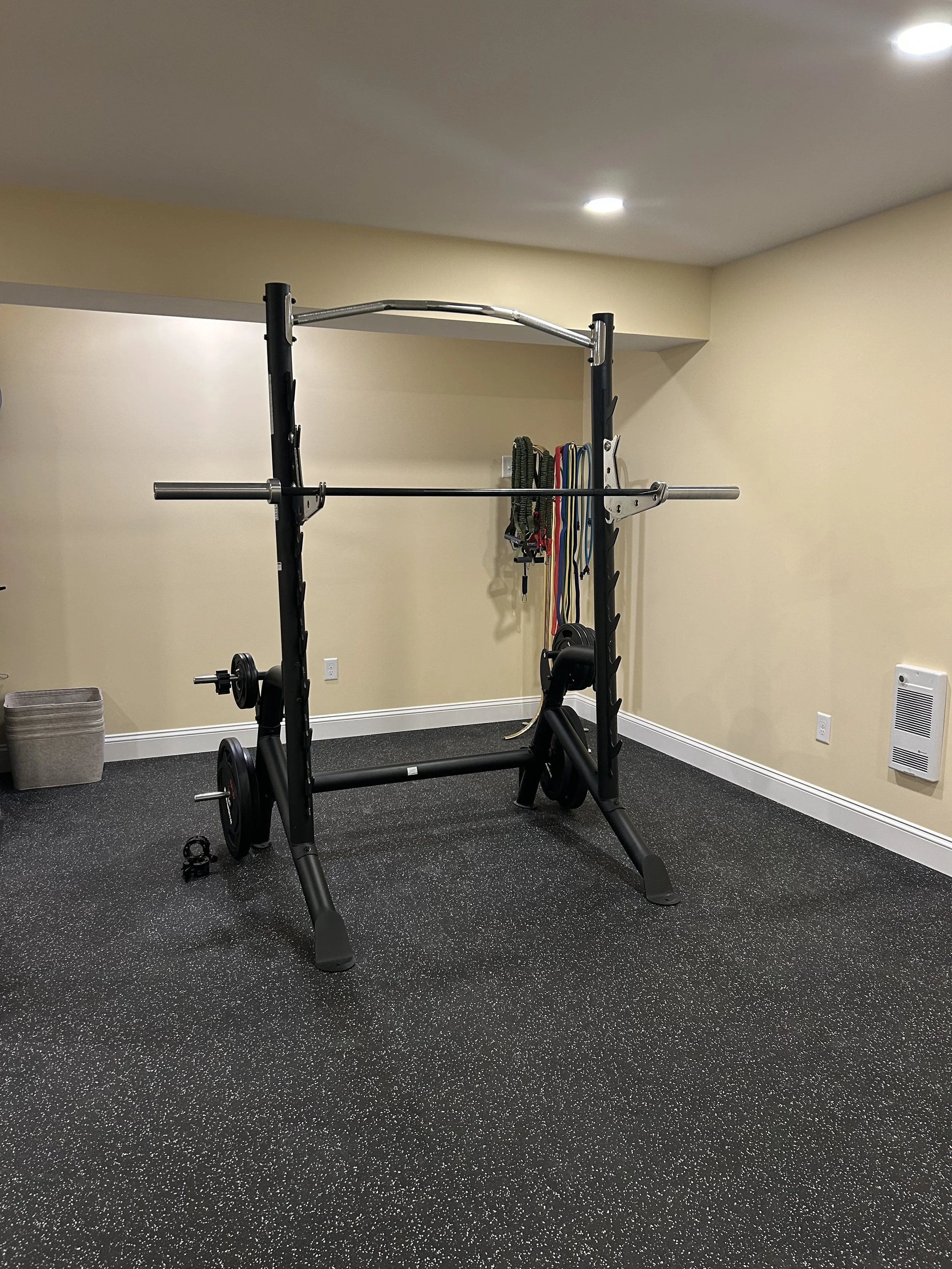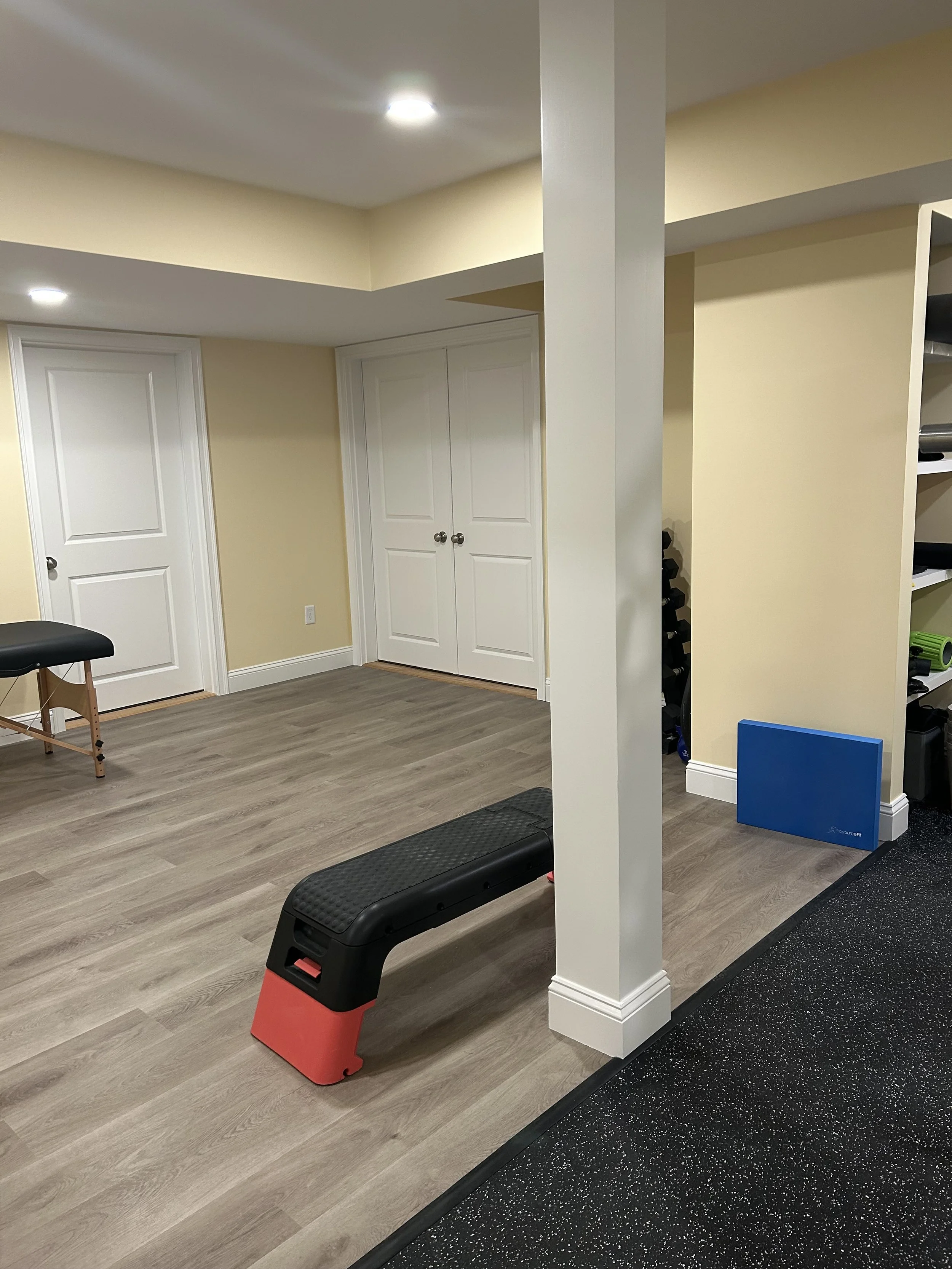 What started as an unfinished basement with exposed insulation and concrete walls was transformed into a fully finished, multi-purpose gym and wellness space by CORE Remodeling Services.