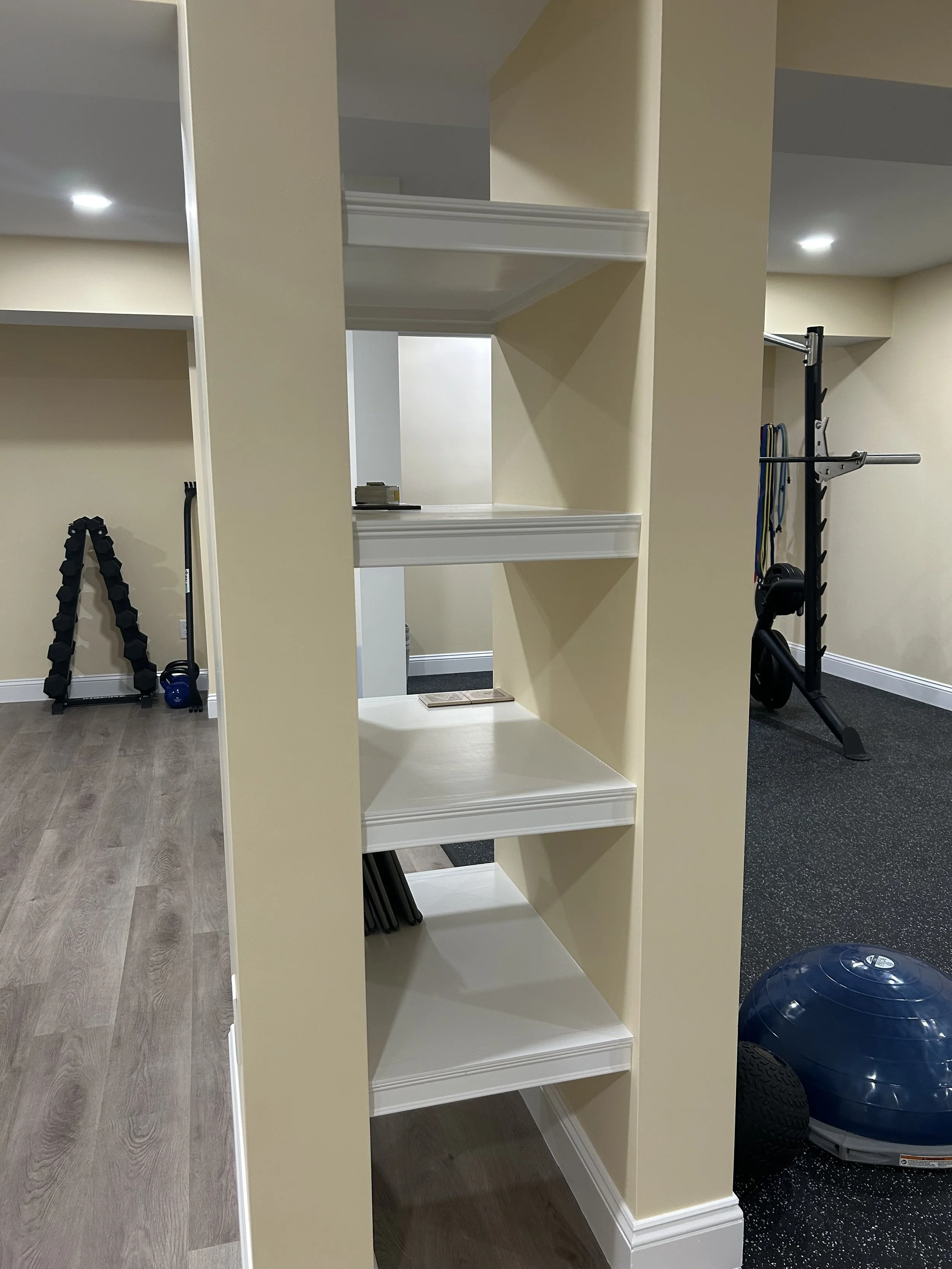 Custom Built-ins: Shelving was added for convenient organization of yoga gear, weights, and accessories—keeping the space tidy and functional.