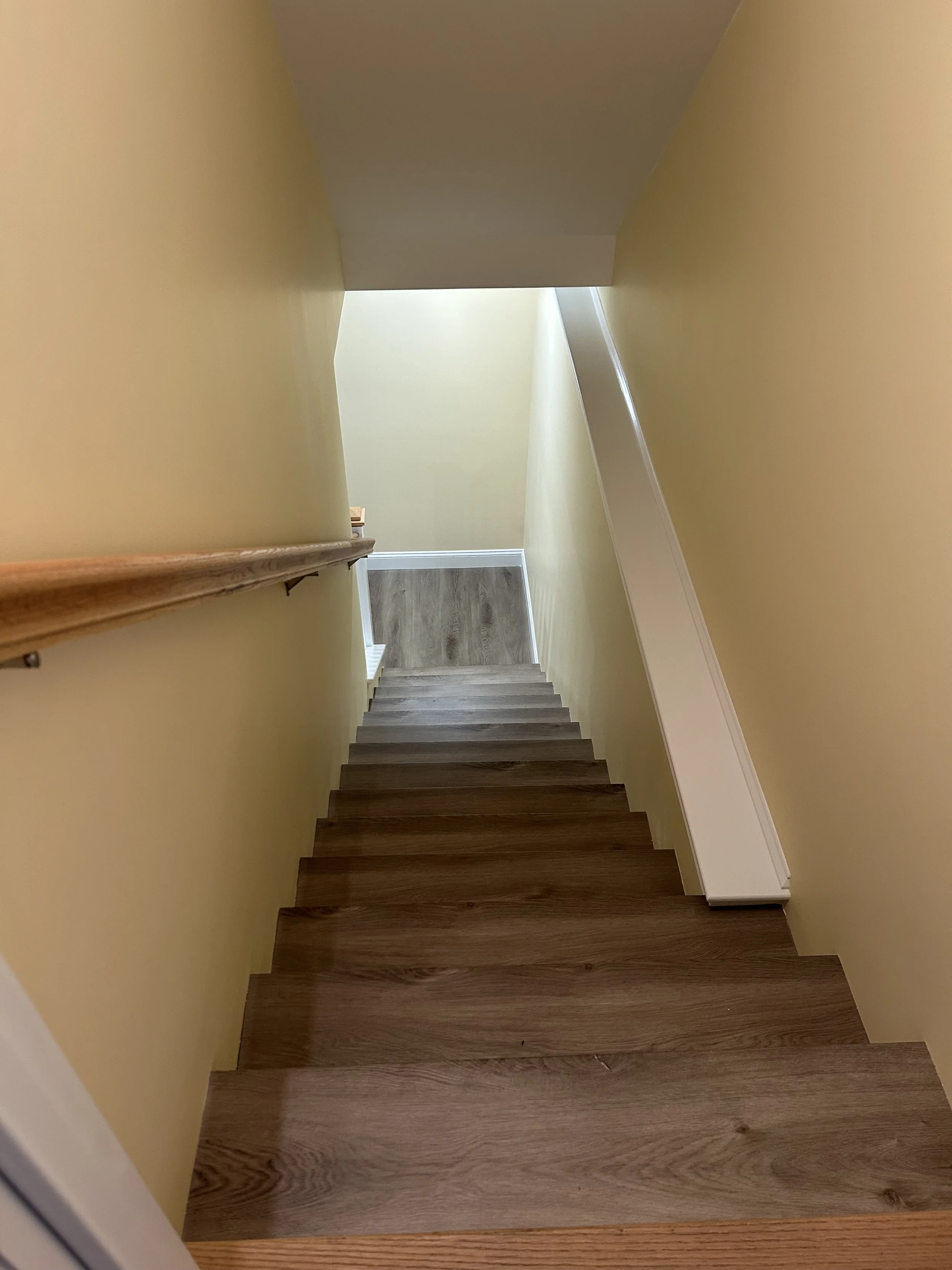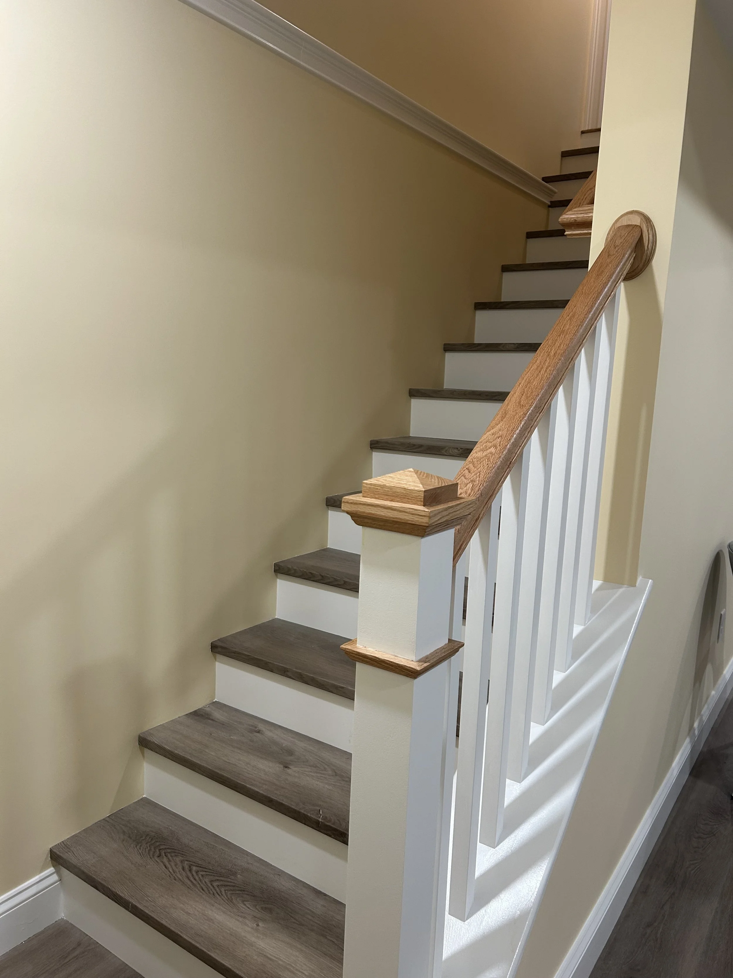 Staircase Upgrade: The new staircase features MSI Prescott Whitfield Gray stair treads and a Red Oak Contemporary Wood Box Newel Post for a sleek, modern entry to the gym.