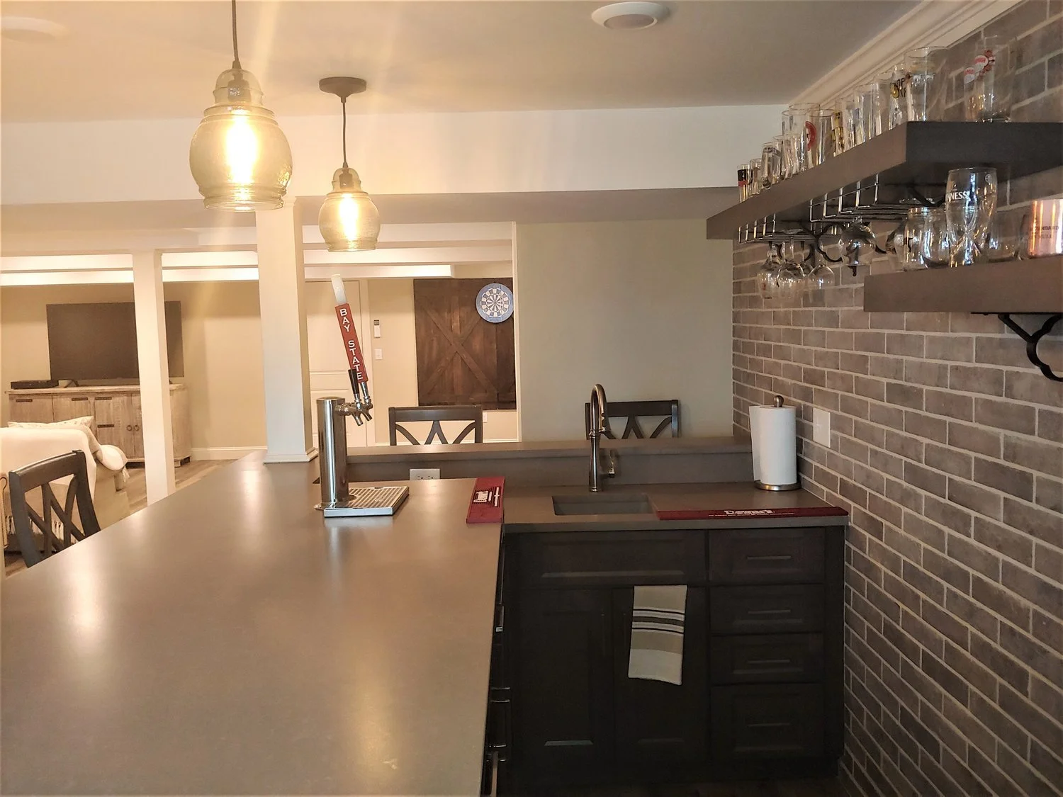 The custom bar area features Statesville full overlay maple cabinetry and a sleek Ludlow Tan-Velvet bar top—the perfect combo of durability and style. The Capella Taupe 2x10” porcelain tile backsplash adds texture and warmth. With a built-in refrigerator, kegerator, and sink, this full-service bar makes hosting effortless.