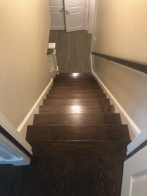 The stairway features oak risers and treads, with a newly added oak handrail and balusters on the left side, providing both style and safety. The stair treads and handrail were stained in a custom color chosen by the client and finished with a durable urethane coating. All other components, including the stair risers, balusters, newel post, and trim work, were painted in crisp white for a fresh, modern look.