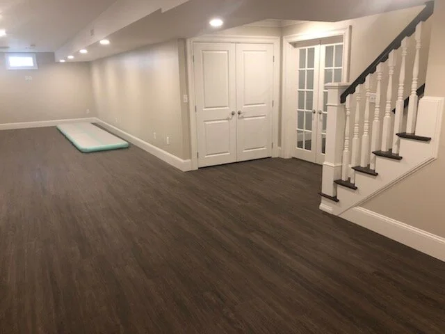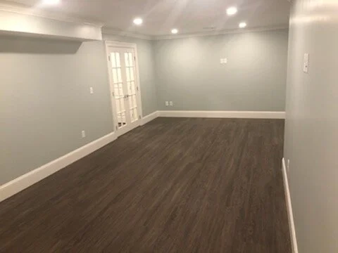 Throughout the basement, luxury vinyl plank flooring in Alto Plus Miletto was installed for durability and elegance. Doors were installed according to the design plan, including a set of double French doors at the bottom of the stairs. All window, door trim, and base mouldings were upgraded to match the existing home’s style, with polished chrome hardware for a sleek, cohesive finish. One-piece crown moulding was added throughout the living space to complete the refined design, closely matching the home’s original trim.