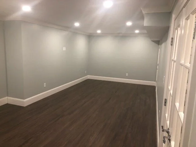The basement is illuminated by 24 warm white recessed LED lights, each on standard dimmer switches to create a customizable ambiance. All walls, framed ductwork, and ceilings were finished with smooth plasterboard, ensuring a clean, polished look.