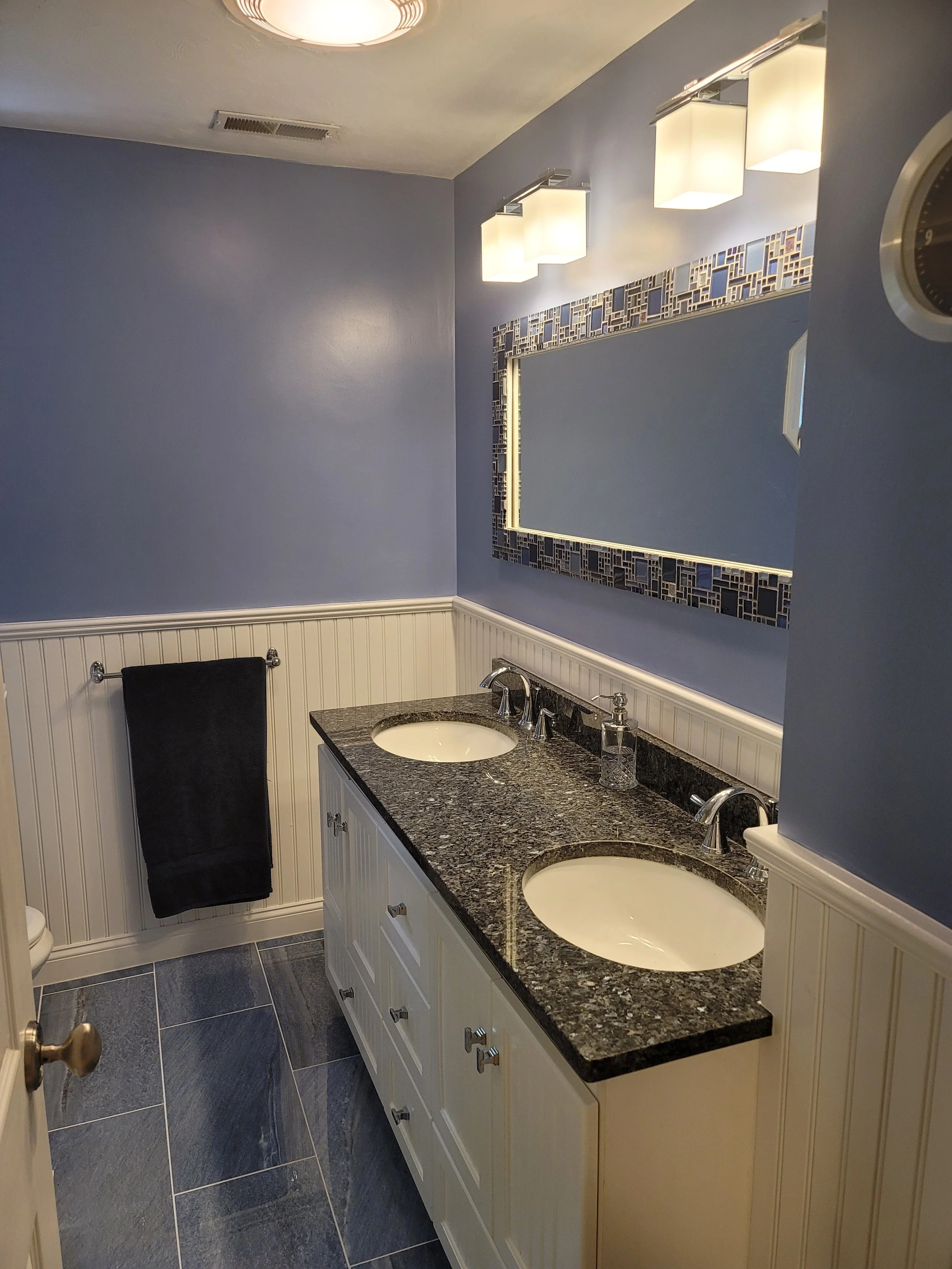 This bathroom renovation blends modern design with personalized details to create a fresh, functional space. At the heart of the design is a Blue Pearl natural granite vanity top, polished with a pencil edge and featuring two sink cutouts. Paired with two white oval undermount sinks, it offers a sleek and minimalist aesthetic. The vanity is completed with Signature Hardware Provincetown two-handle widespread bathroom sink faucets, adding a refined touch of contemporary elegance.