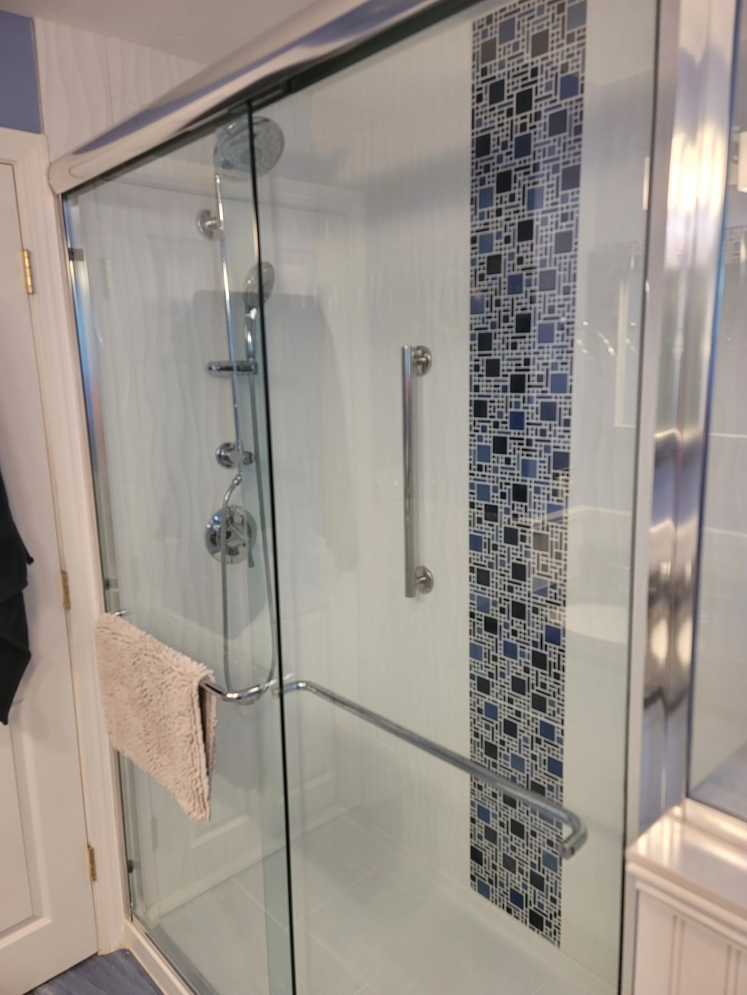 The shower is a standout feature of this remodel, with a Delta Classic 400 60" L x 32" W alcove shower pan base in high gloss white, providing a clean and modern foundation. To ensure durability and style, the shower floor is paired with a Oatey round PVC and stainless steel drain. The shower walls feature a striking Blue custom strip of tile, adding a pop of color and personalized flair that ties the space together. A custom clear shower door with a half-glass wall enhances the open, airy feel of the shower while offering efficient separation from the rest of the bathroom.