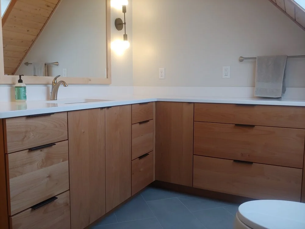 The vanity is a Mouser Vanity with elegant Barrington doors and a triple-drawer base, completed with a White Zeus Extreme Polished Pencil Edge granite countertop. It’s paired with a White Ladena 21x14 undermount sink and an Alteo single-control faucet, creating a clean and modern focal point. For the shower fixtures, we installed Alteo Rite-Temp Shower Trim, a Rite-Temp Valve with Diverter, a Multi-Function Hand Shower, a Master Shower 60" Hose, and an Exhale Supply Elbow with Bracket for enhanced convenience and flexibility.