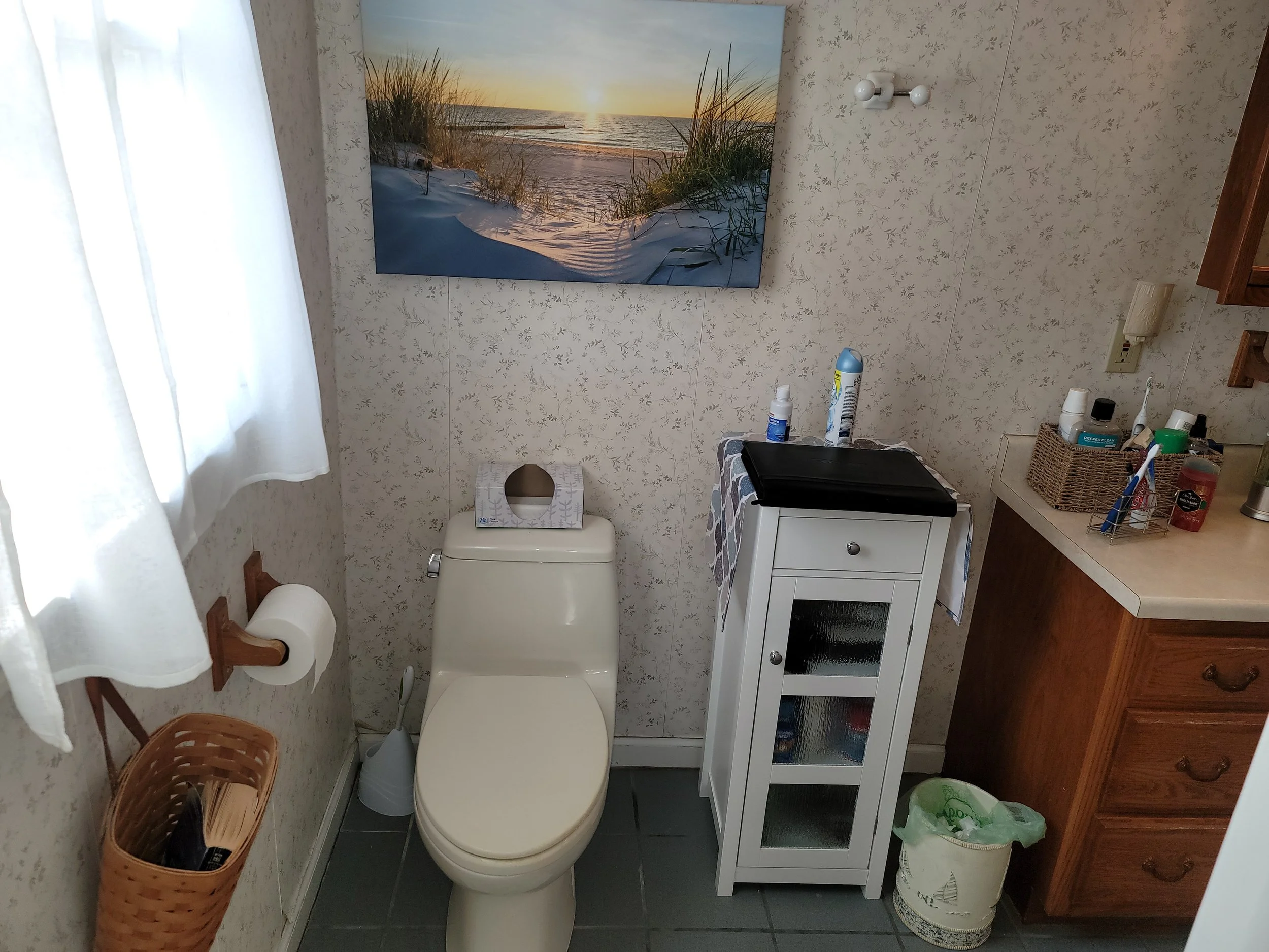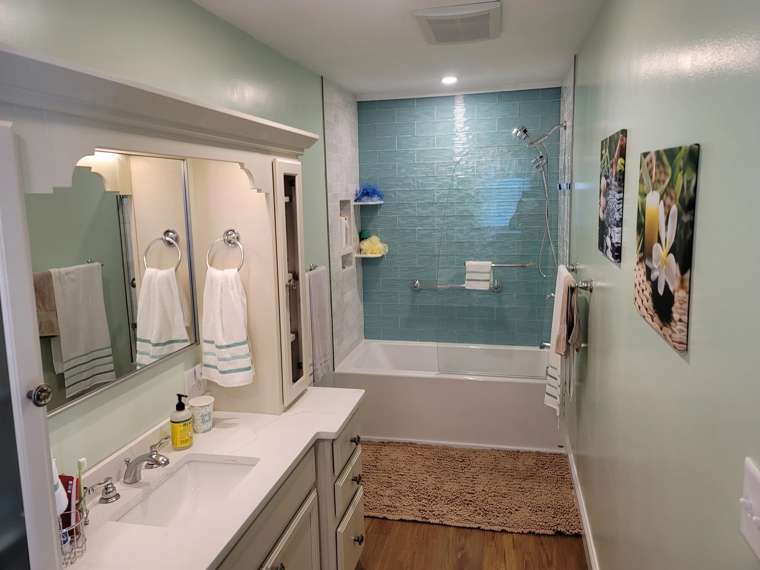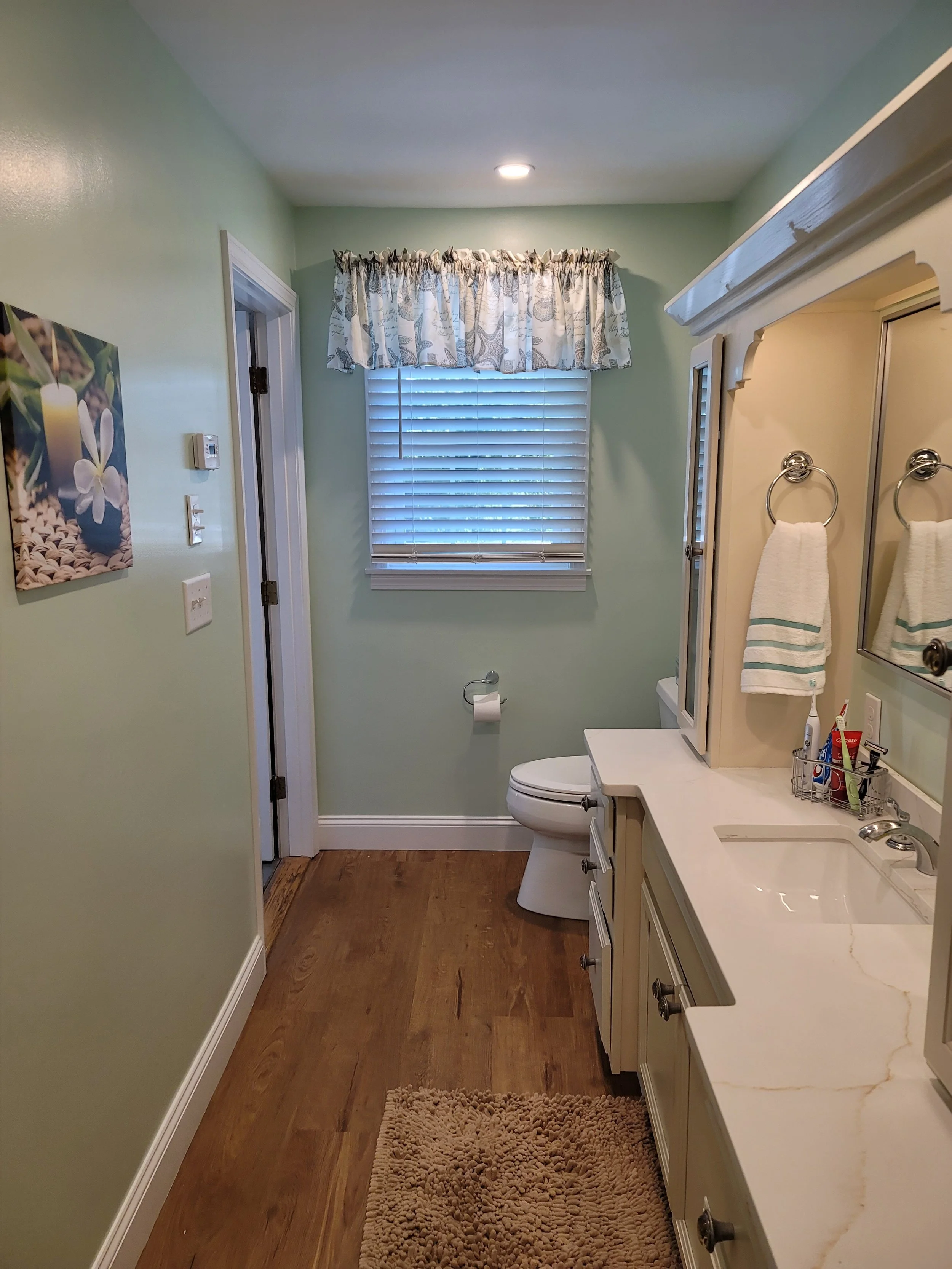 Installed a 60" single bowl Vanity Cabinet Door style 310 in Painted Silk from Waypoint with hardware from Wayfair. We built a custom valance above the vanity with LED strip lighting. The countertop is Calcutta Zion with a 4” backsplash pencil edging and a rectangular undermount sink. Installed a Kingston Brass KB951FL Royale 1.2 GPM widespread bathroom faucet with pop-up drain. The vanity doors are to have glass inserts. For accessories we installed Savina modern & contemporary mirror. Kingston Brass BA7971C English Vintage 24" towel bar and a Miseno MNOTP700CP Bella Toilet Paper Holder. The toilet is a Kohler K-3658-0 elongated comfort height two piece from the Highline collection.
