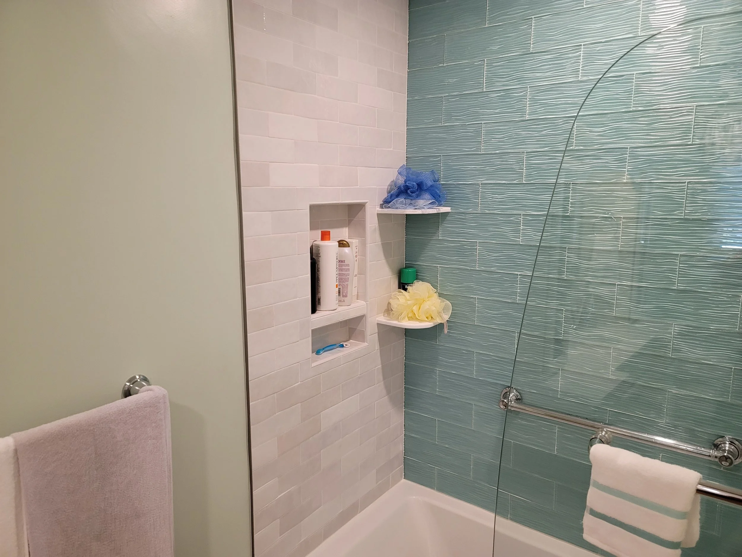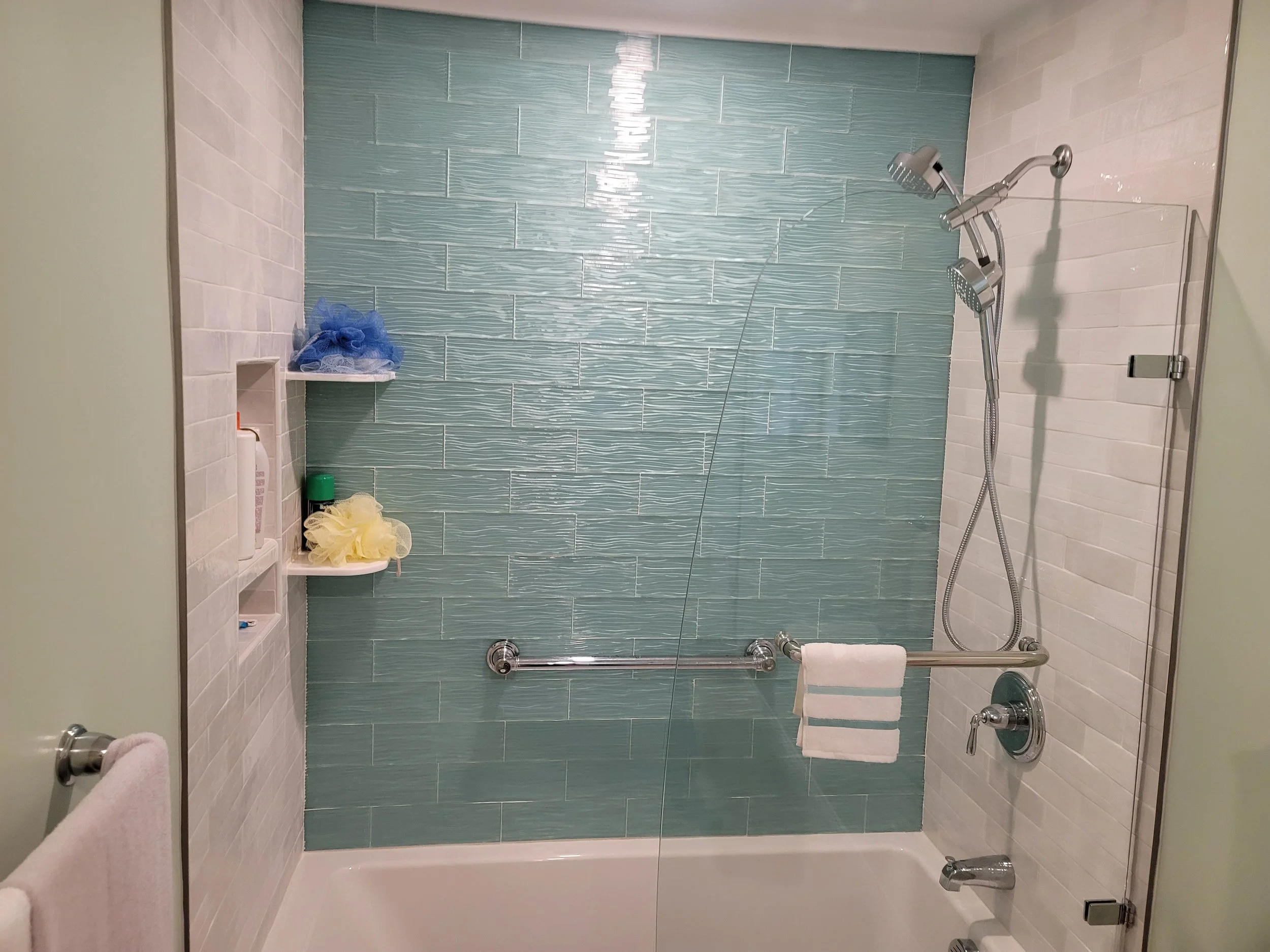 Tub is by American Standard 2946.102.011 Studio 60" x 32" Alcove soaking bathtub with right drain. The tub/shower door is by Anzzi SD-AZ8074-01 58" High x 34" wide hinged frameless. Shower fixtures are from Kohler: Kohler Awaken 1.75 GPM multi function shower head model: K-23218-G-CP polished chrome, Kohler K-TLS395-4S-CP Devonshire rub and shower trim package - less shower head Kohler K-8304-K-NA. The side shower walls are tiled with Equipe; Artisan Series; 2-1/2" x 8" White; for the back shower wall the Crystile Wave Series Soft Mint Tile. We added corner shelves from Jeffrey Court Morning Fresh in White 7.625 in. x 7.625 in. Polished Marble. Bright White Grout Home depot.