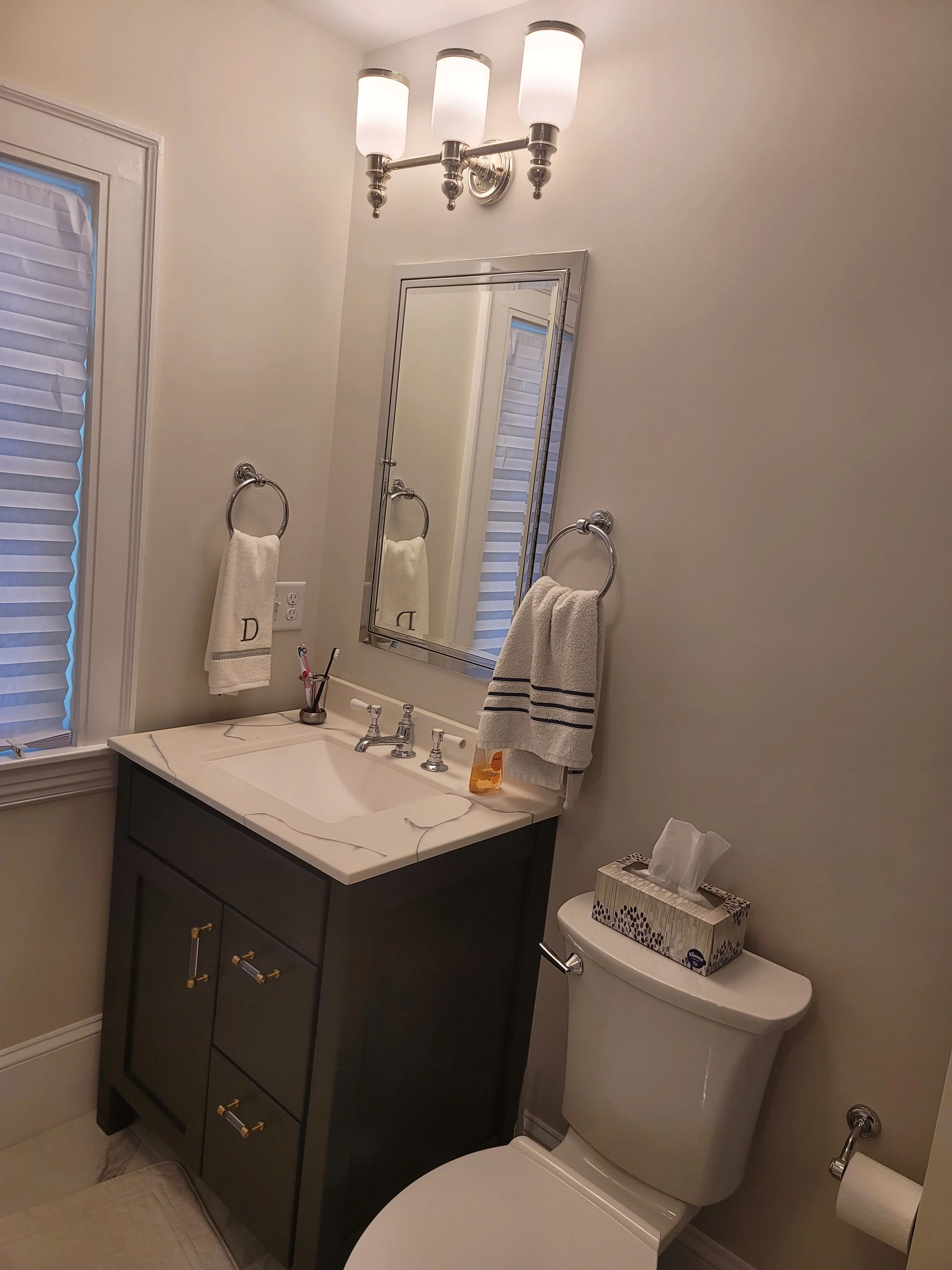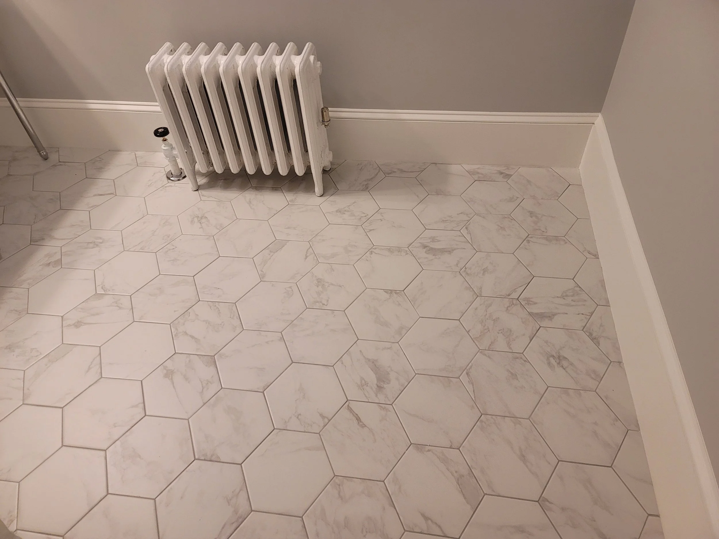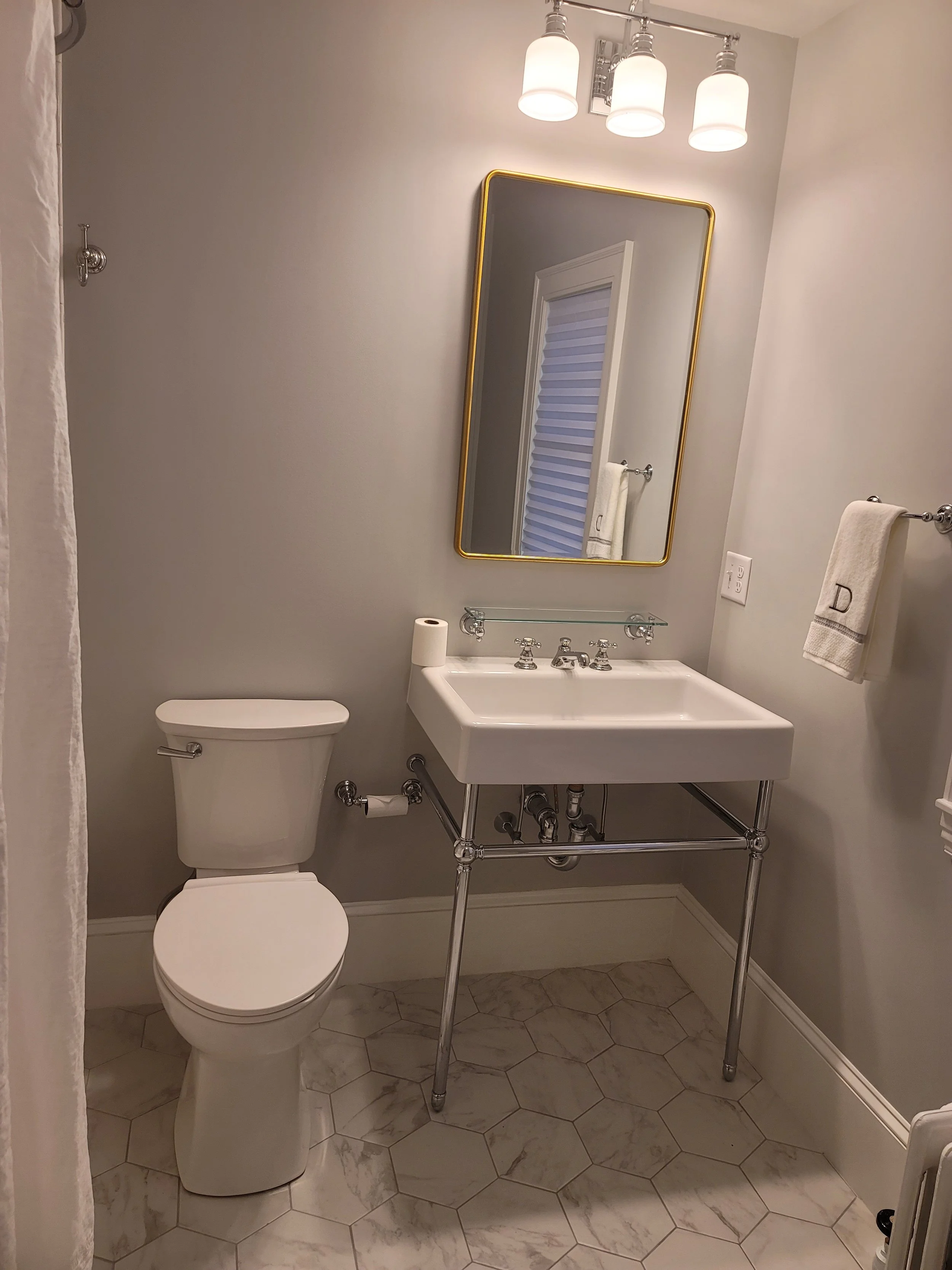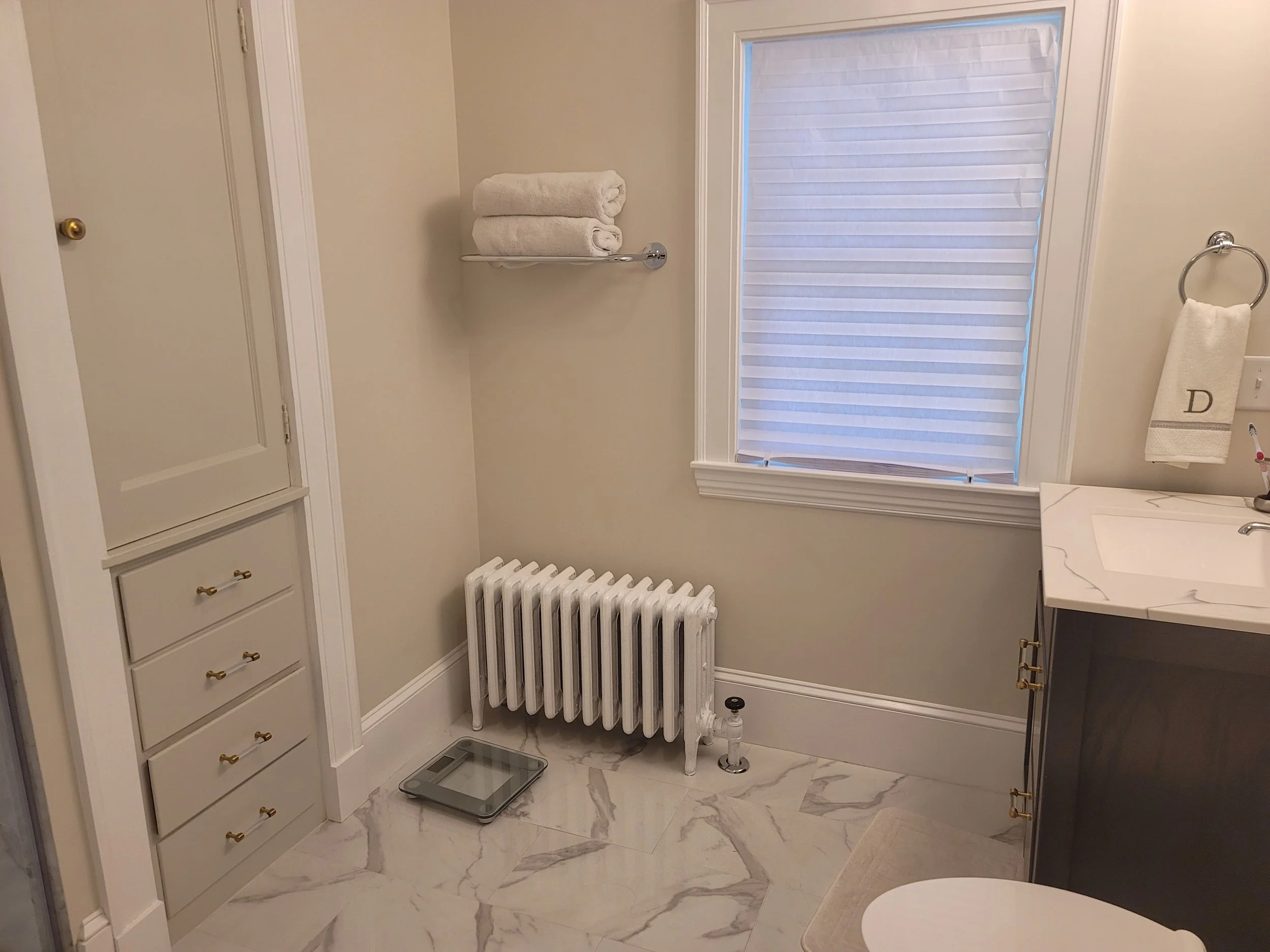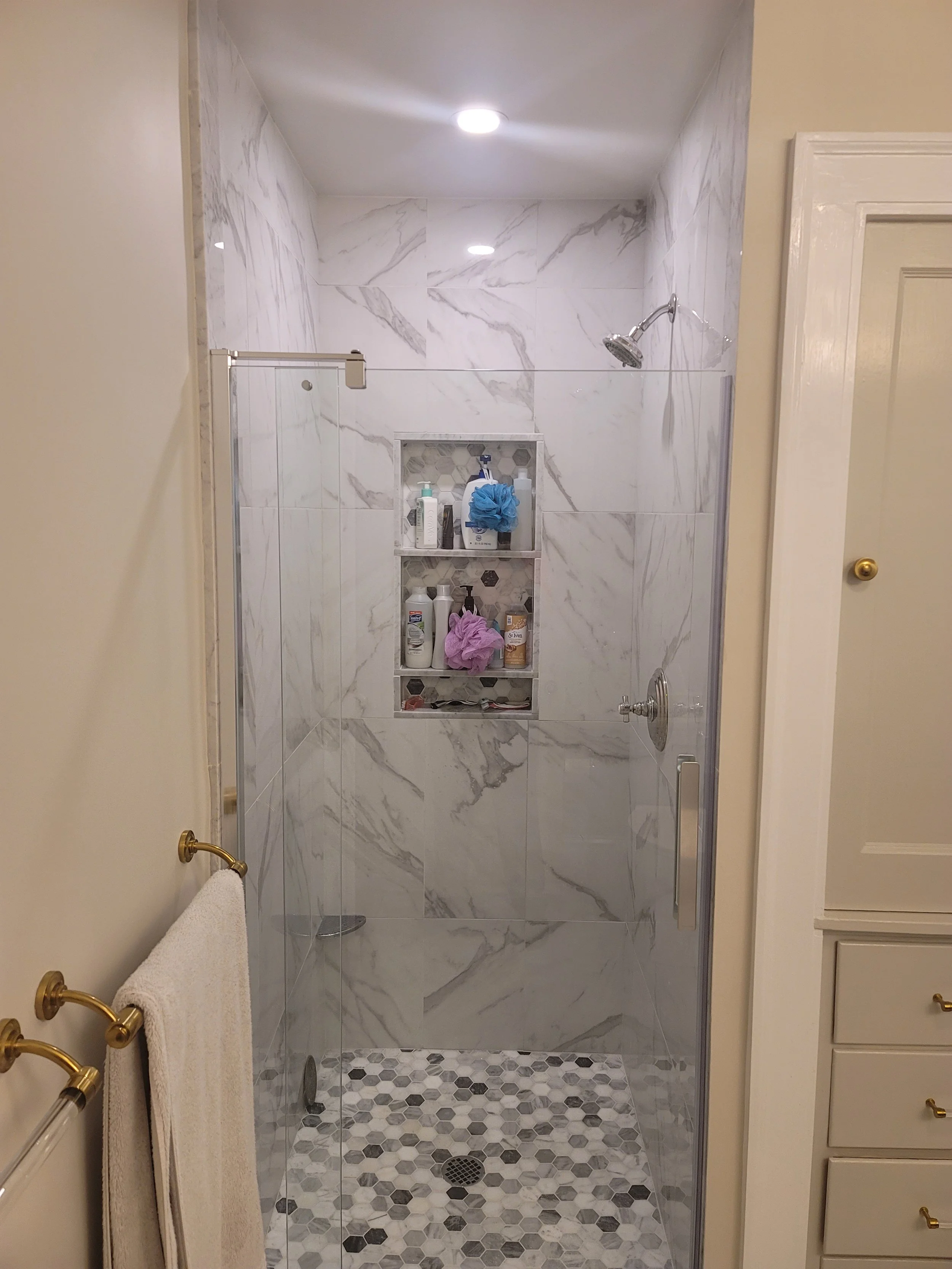 Installed a master bath shower door crafted by Kohler in Bright Polished Silver, a striking addition to the space. The Revel model stands tall at 70 inches high and spans 35-1/8 to 40 inches wide, offering both elegance and functionality. Complementing this feature, brand-new toilets from American Standard in White Edgemere Elongated Comfort Height provide comfort and style. The master bath's stone shower perimeter boasts Carrara Marble remnants, enhancing the luxurious feel. The tile used in the master bath resembles Carrara Marble, made from Porcelain, adding a touch of sophistication to the overall design.