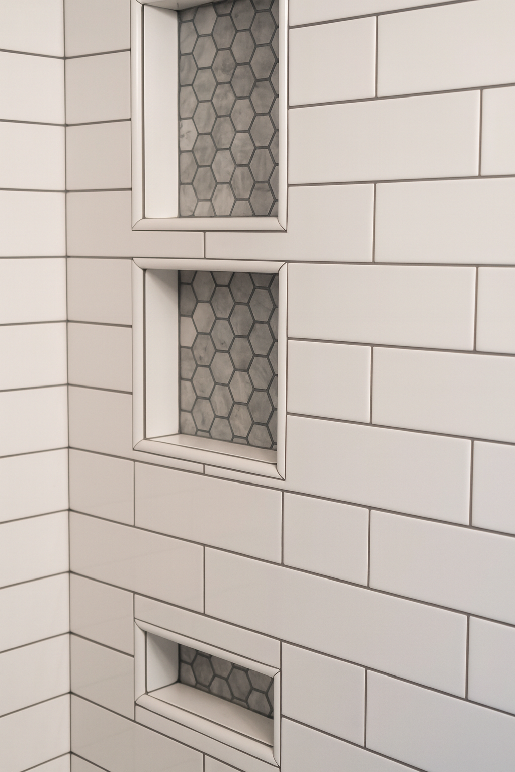 Three recessed niches with Carrara White hex tile backing provide elegant and practical storage.