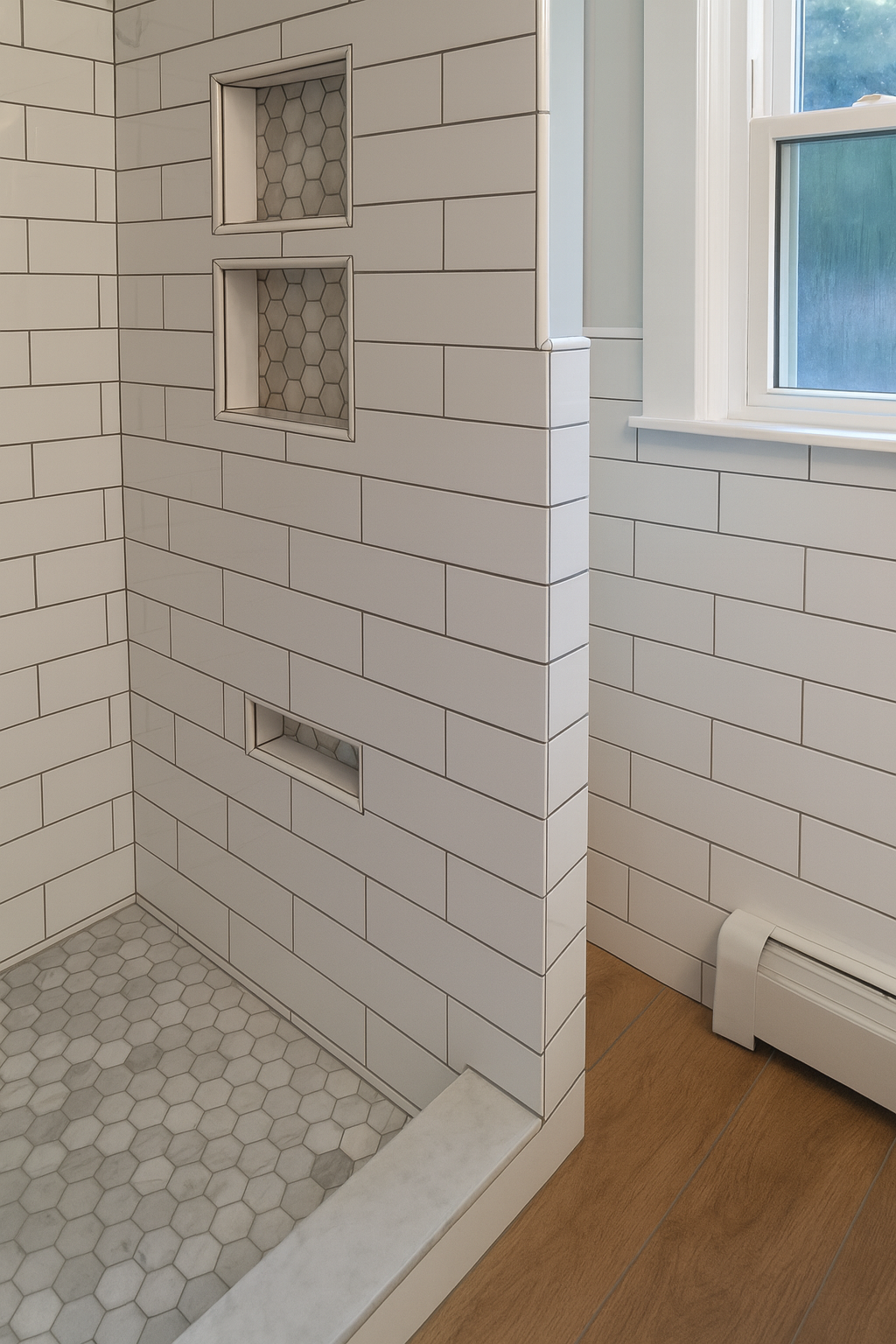 Custom shower with white subway tile walls, Carrara hex tile flooring, and recessed niches for storage.