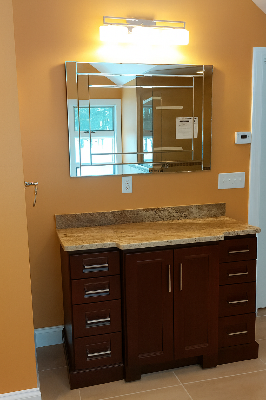 The vanity area highlights Homecrest Verano cabinets in a Sorrel stain, topped with Granite Sienna Bordeaux vanity tops finished in a 3/8" pencil edge. Above, a Décor Wonderland Frameless Terassa Wall Mirror adds modern elegance, while lighting is provided by Cetyna Z-Lit fixtures (one 2-light and one 3-light) to brighten the space. Plumbing fixtures include a Kohler Forte widespread faucet with pop-up drain in chrome for the vanity and an American Standard Evolution 2 elongated two-piece toilet with Right Height bowl and soft-close seat.