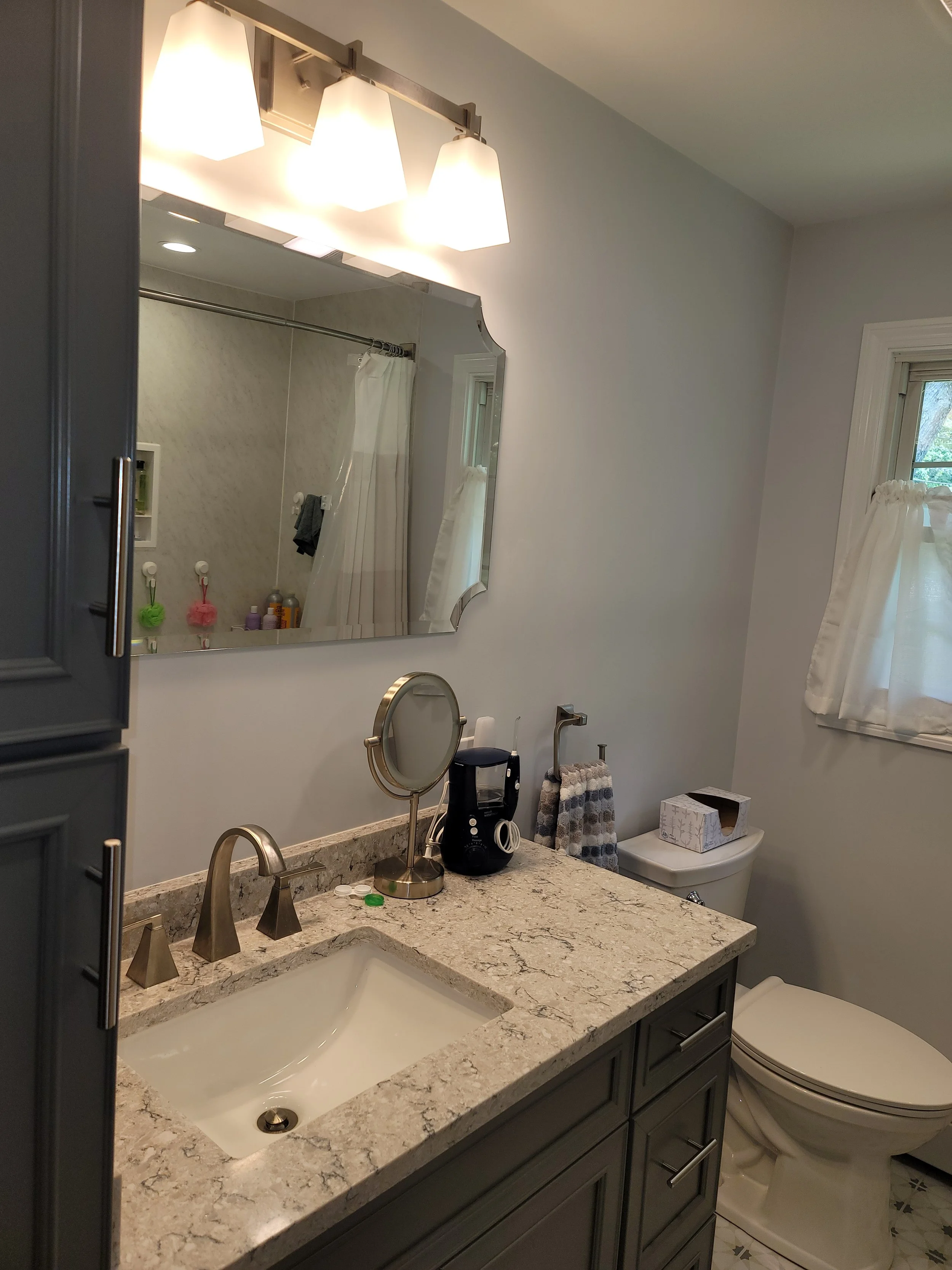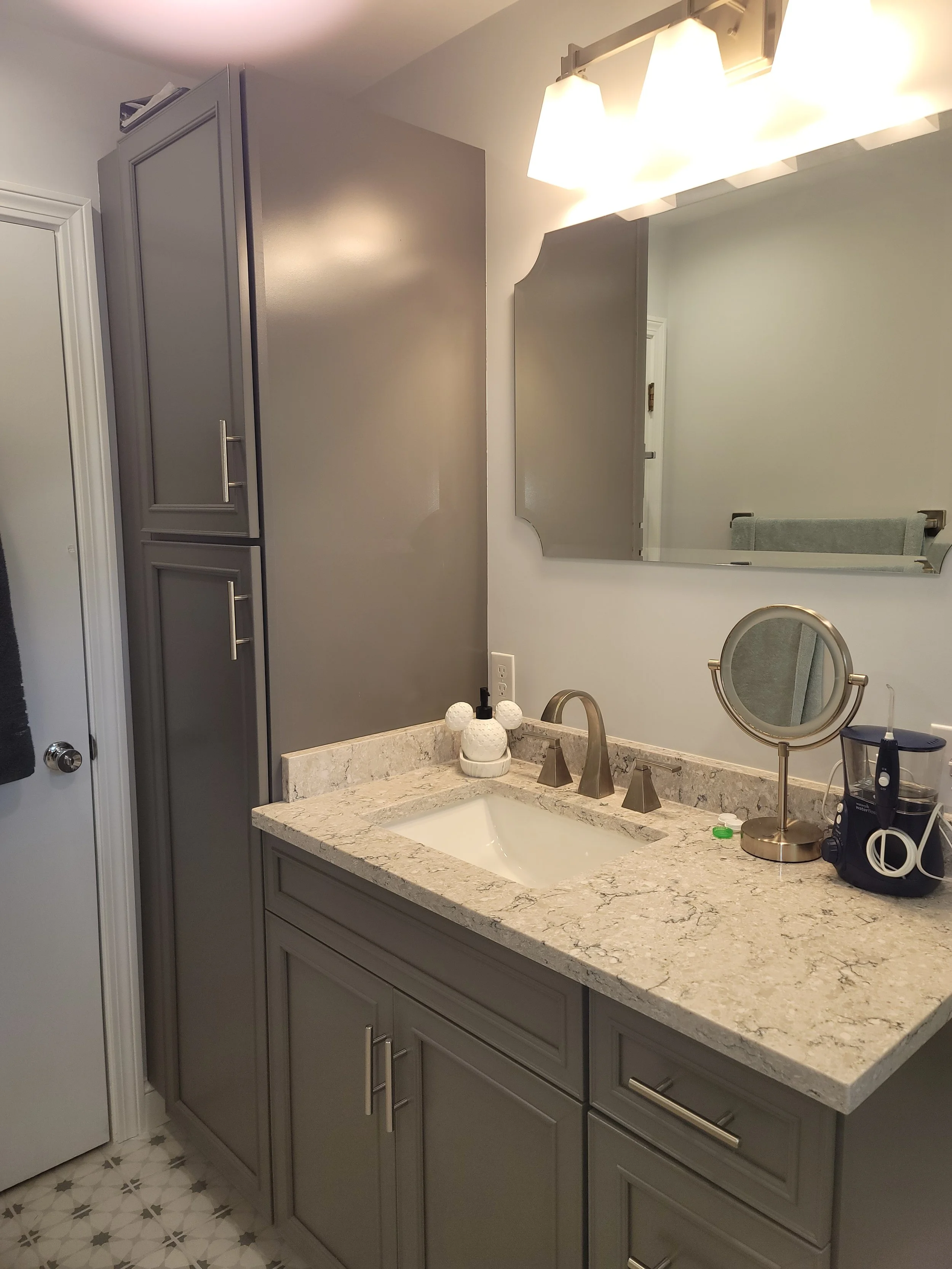 We installed a stunning Waypoint 540F Painted Boulder vanity measuring 42" x 34", complete with butt doors and a spacious vanity linen tower featuring cushion-close deep roll-out trays for enhanced storage. The vanity is topped with luxurious Pietra Quartz (43"), featuring a sleek rectangular undermount sink, pencil edge detailing, and a 4" backsplash. Satin Nickel Naples hardware from Hardware Resources adds the perfect finishing touch. Above the vanity, a Delacora Scalloped Mirror Medicine Cabinet (36" x 24") complements the space beautifully, paired with the elegant Signature Hardware Hoxton 3-Light Vanity Light with frosted glass shades.