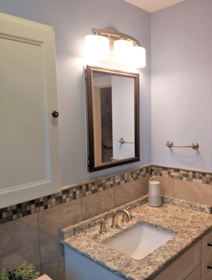 For added storage, a Kohler single-door recessed mirrored medicine cabinet with an oil-rubbed bronze finish offers elegance and utility. The vanity area is illuminated by the Kichler Kelston 24" brushed nickel 3-light vanity light, bringing a warm and inviting glow.