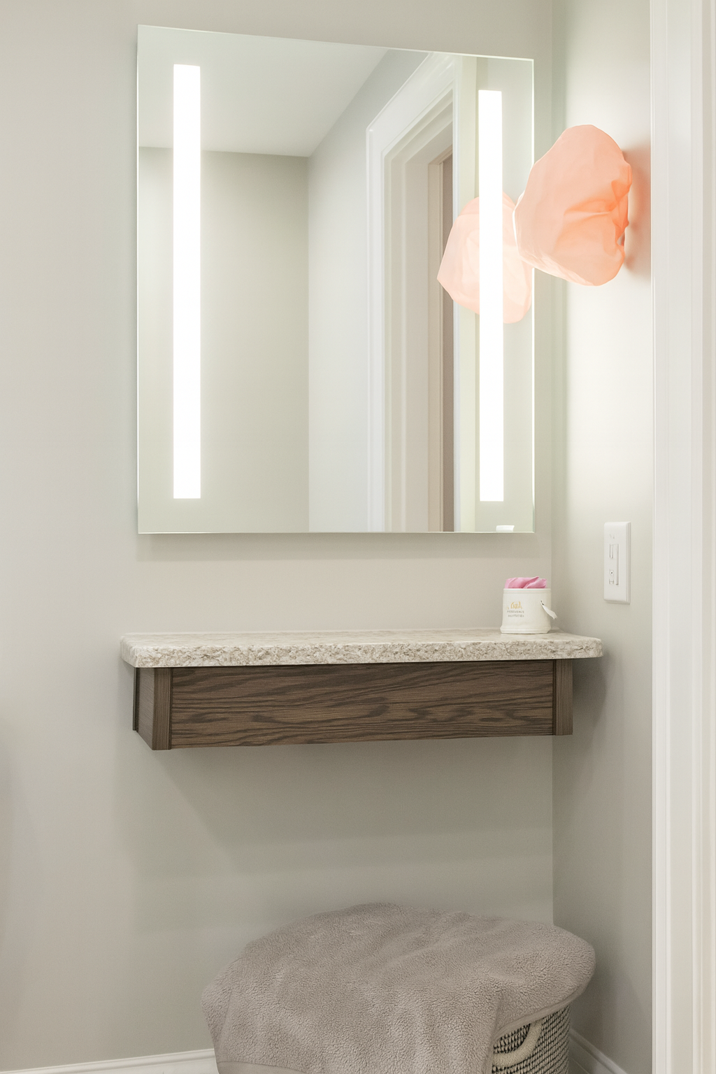 Viatera Everlast Quartz floating shelf with lighted mirror and soft neutral finishes in this Worcester, MA bathroom remodel.