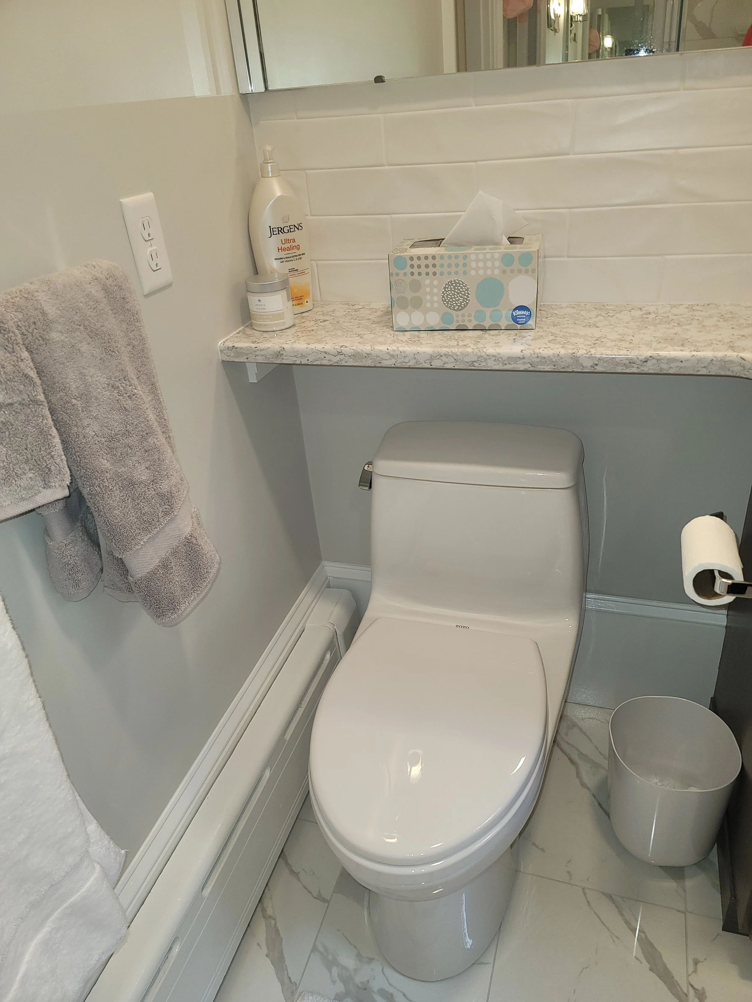 Viatera Everlast Quartz floating shelf with light, neutral tones adds function and style above a Kohler San Souci comfort-height toilet.