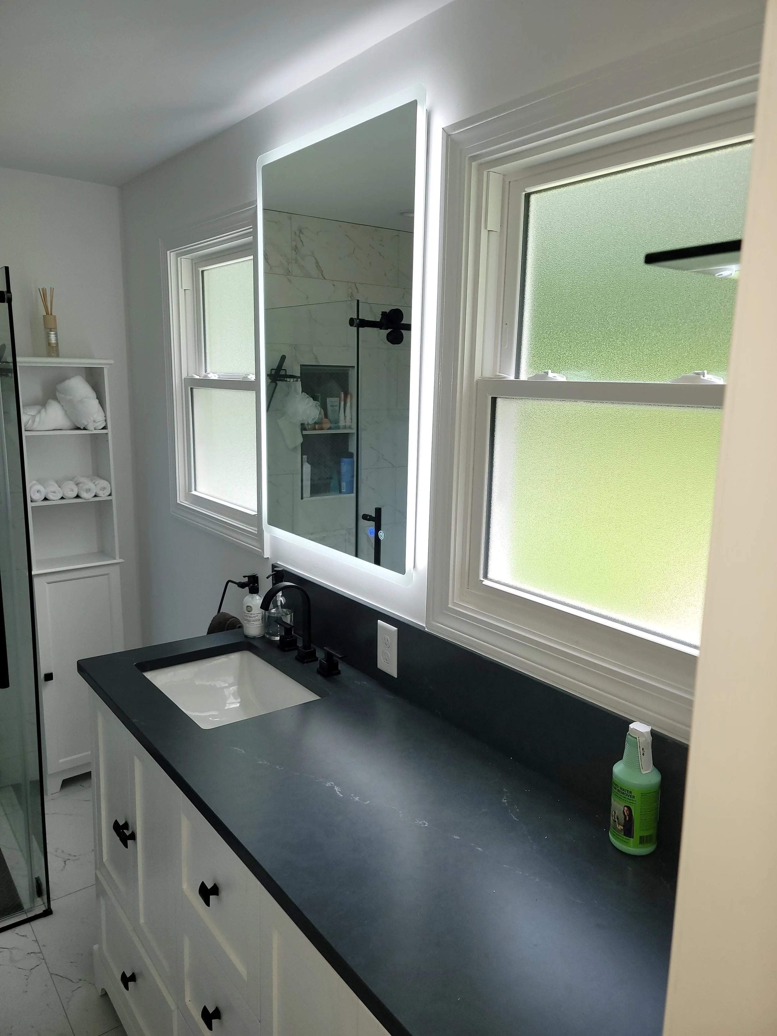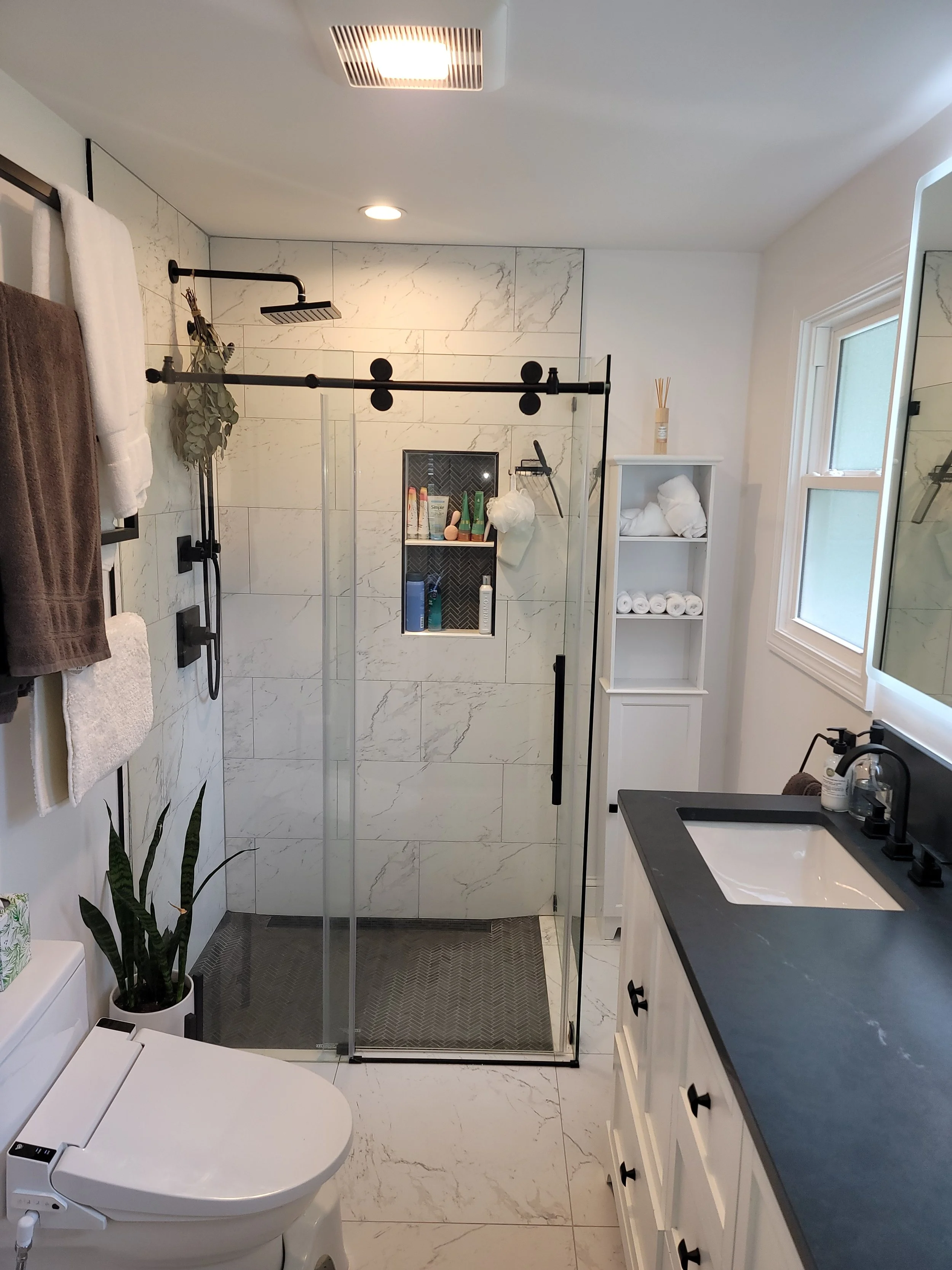 For the vanity area, we installed a 60" Addington Vanity in White by Hardware Resources, topped with a luxurious LAOS Cosentino Dekton leathered finish countertop and 8" backsplash. The vanity is complemented by a Miseno Modern Widespread Faucet in matte black. The shower system features the Miseno Elysa Pressure Balanced Shower System with a 1.8 GPM rain shower head, hand shower, slide bar, and wall-mounted rain shower arm, all in matte black. A Swiss Madison 1.28 GPF One-Piece Elongated Chair Height Toilet and two new ProVia windows complete the space. Custom barn doors were installed for the closet and bathroom entrance, adding a personal and stylish touch.