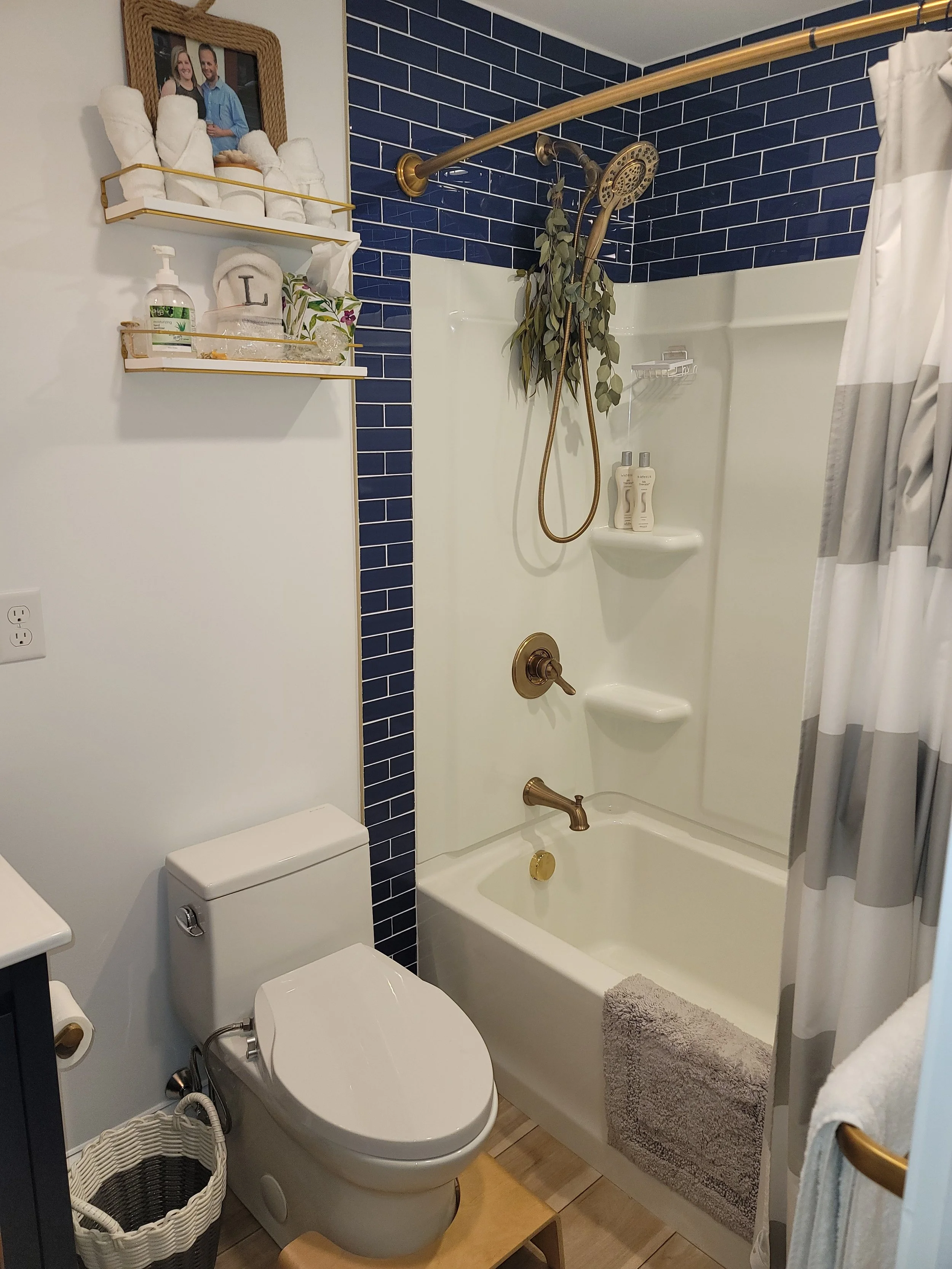 In the Family Bathroom, we installed a Sterling Ensemble 60" Vikrell Alcove Soaking Tub with left drain, surrounded by MSI Midnight 3" x 6" subway tiles tiled to the ceiling for a bold, modern look. All fixtures are Delta in Champagne Bronze, adding a touch of luxury. The vanity features a 24" Percival Vanity in Hale Blue by Hardware Resources with a Lavante vanity top, paired with a Vigo Satro Single Hole Faucet in Matte Gold. Above the vanity, a stylish Golden Lighting Orwell Aged Brass fixture with Navy shades adds character to the space.