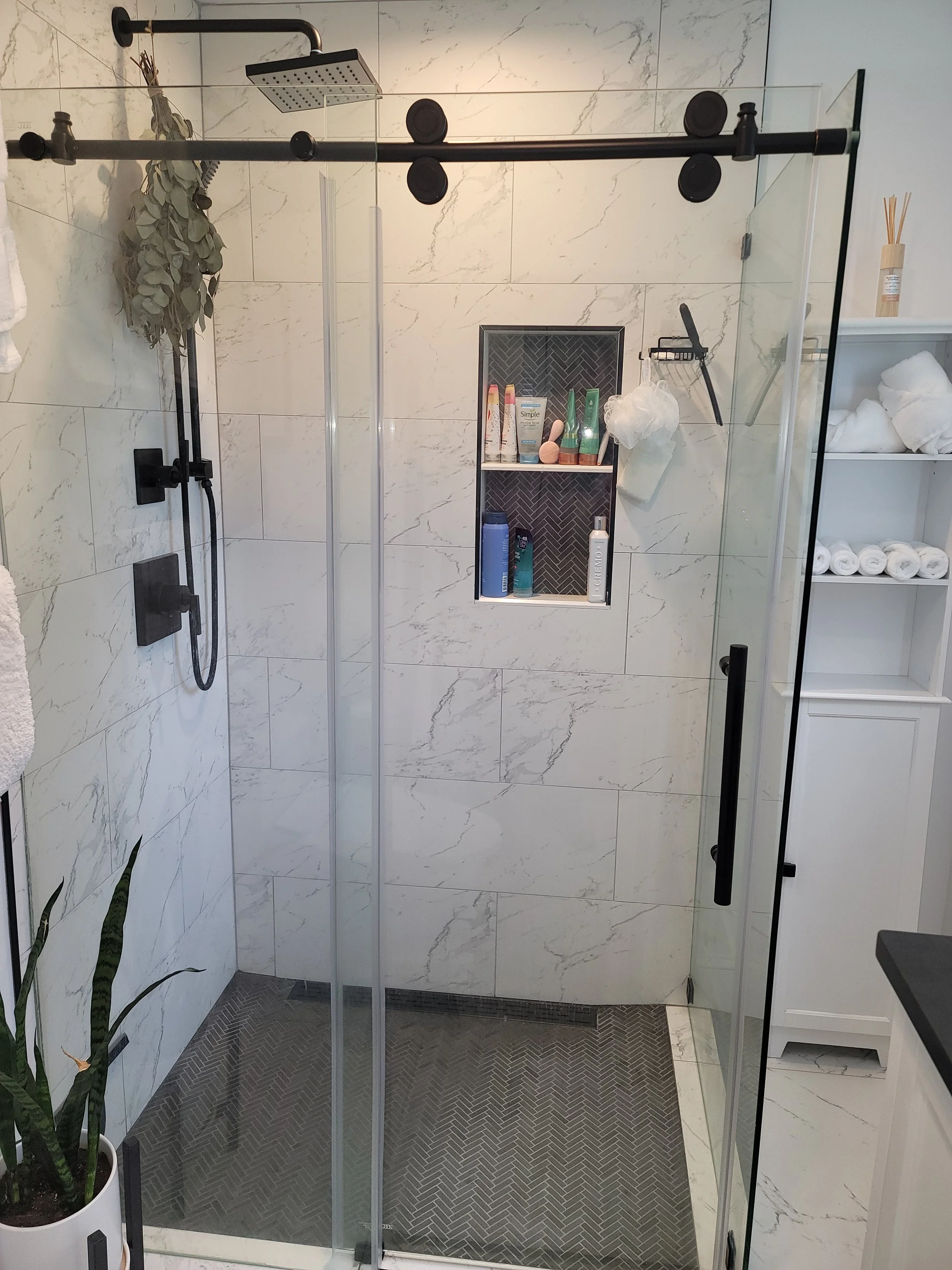 In the Master Bathroom, we created a stunning custom walk-in tile shower featuring Jeffrey Court Basalt Herringbone Gray Mosaic Tile on the shower floor and niche, paired with MSI Pietra Carrara 24" x 24" matte tiles for the shower walls and bathroom flooring. A sleek Signature Hardware Rowland 32" linear drain ensures efficient water flow while maintaining a clean, modern look. The shower is enclosed by an elegant Aston Langham Sliding Frameless Shower Enclosure with clear glass.
