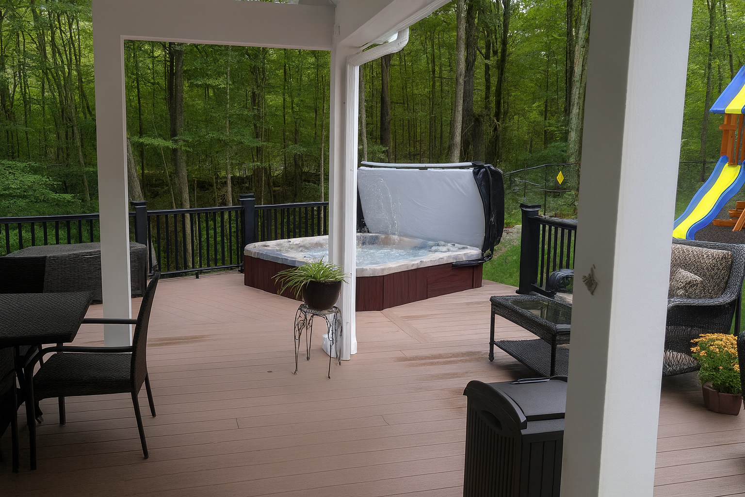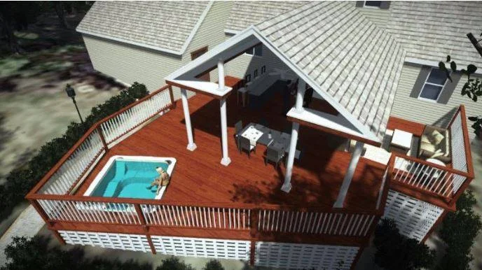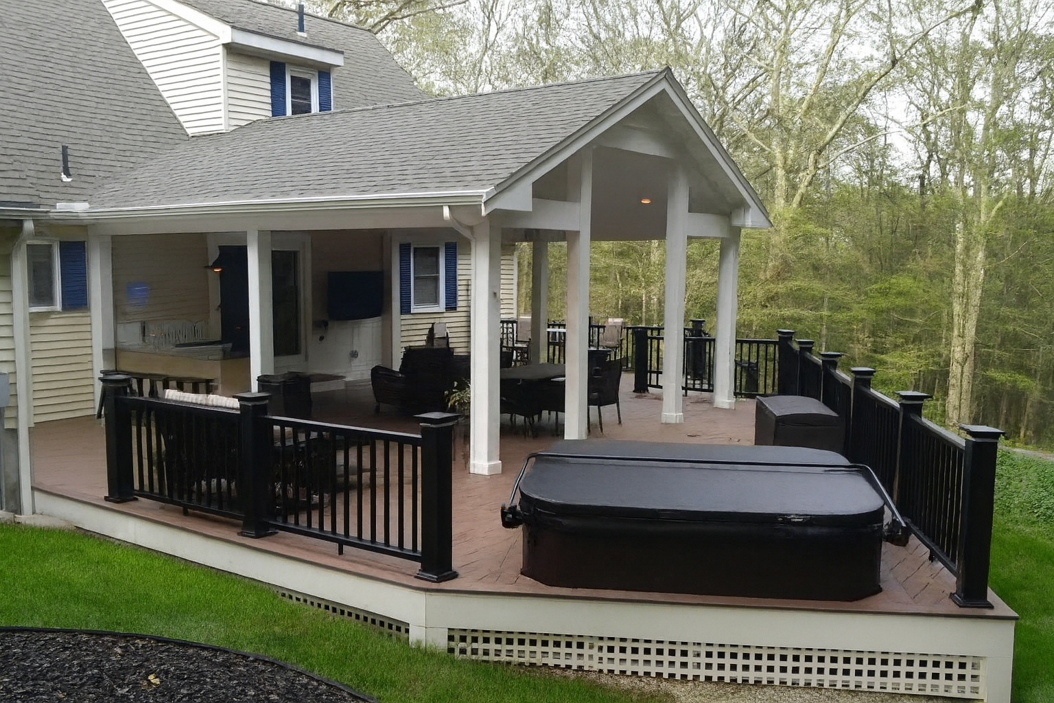 Relaxing hot tub on the TimberTech deck in Douglas, MA, perfect for unwinding beneath the covered pavilion.