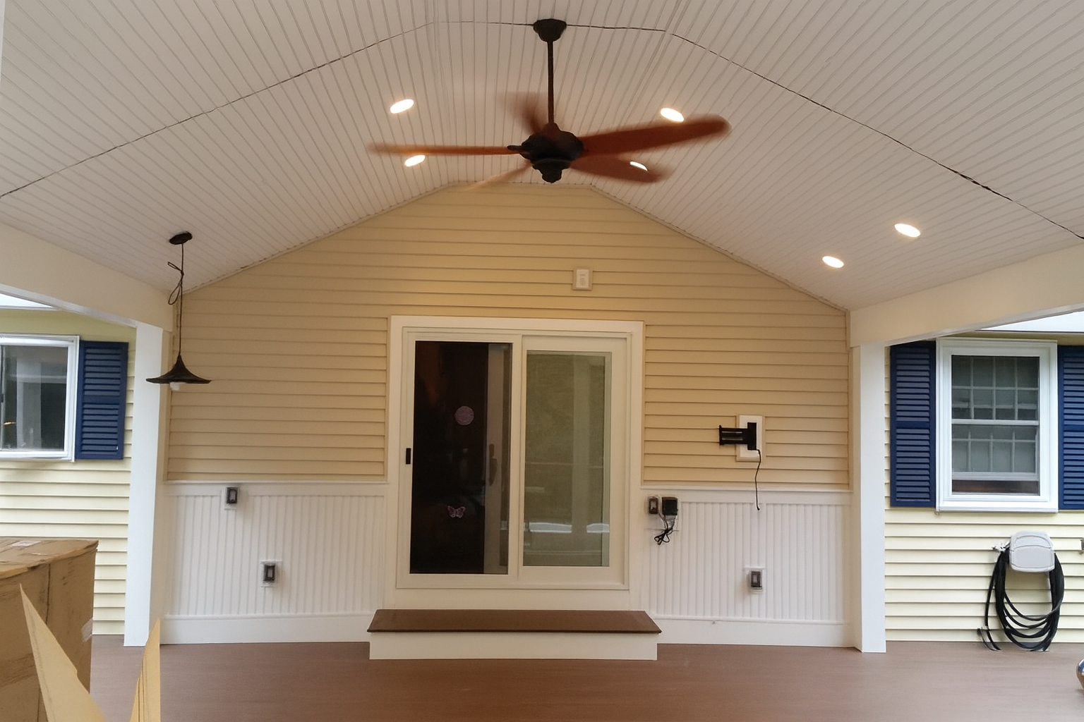 Douglas, MA pavilion with TimberTech deck, recessed lighting, and ceiling fan for year-round comfort.