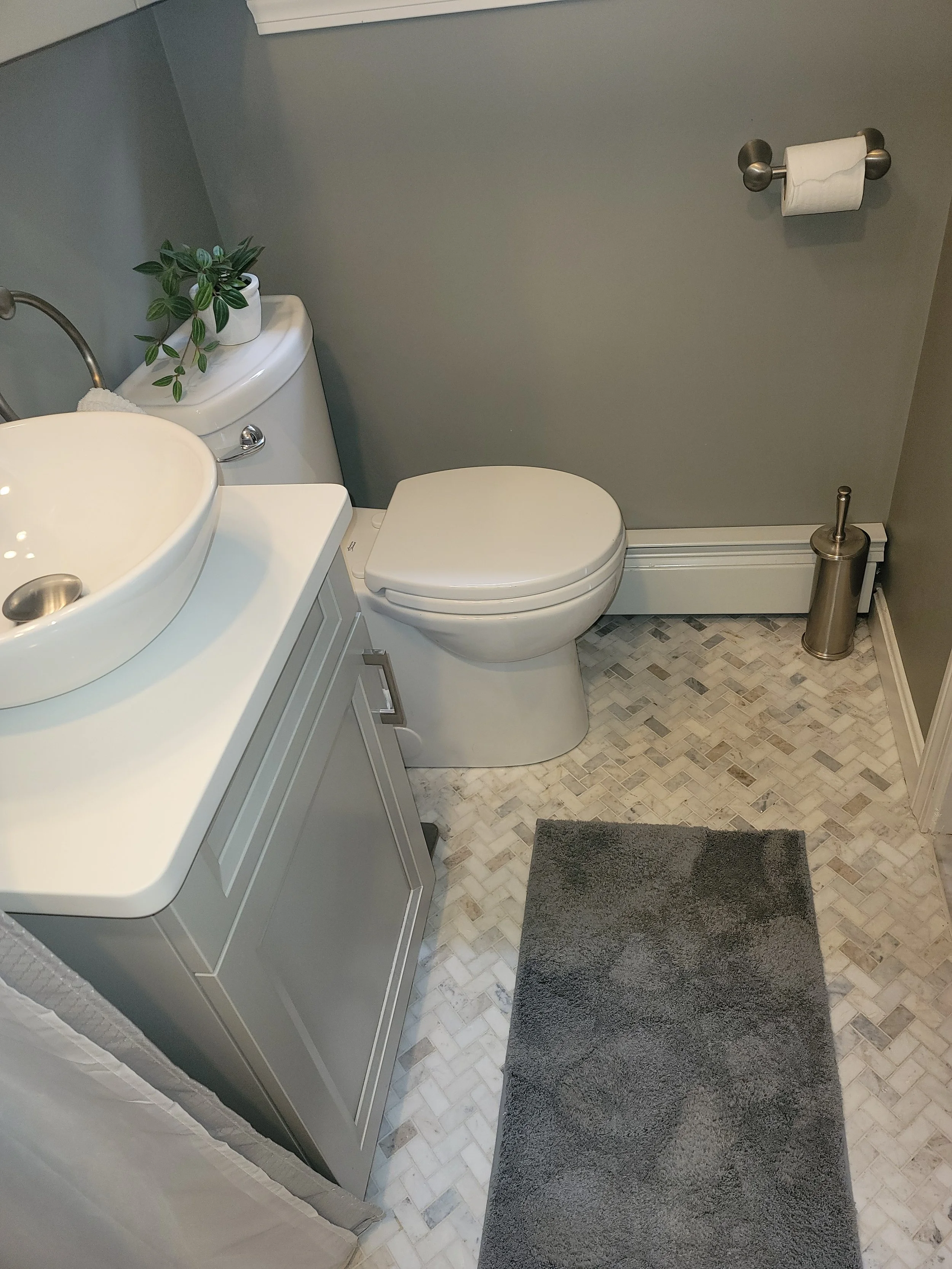 Custom Walk-In Shower: The shower features MSI Praira Carrara matte tiles on the walls, complemented by a 12x20" double-shelf niche with bullnose edges. The Oatey Designline stainless steel linear drain paired with MSI Arabescato Venato white herringbone tiles honed adds a refined touch. A convenient caddy corner shelf and the Mohen Gibson showerhead with a pressure-balanced valve provide both style and function.