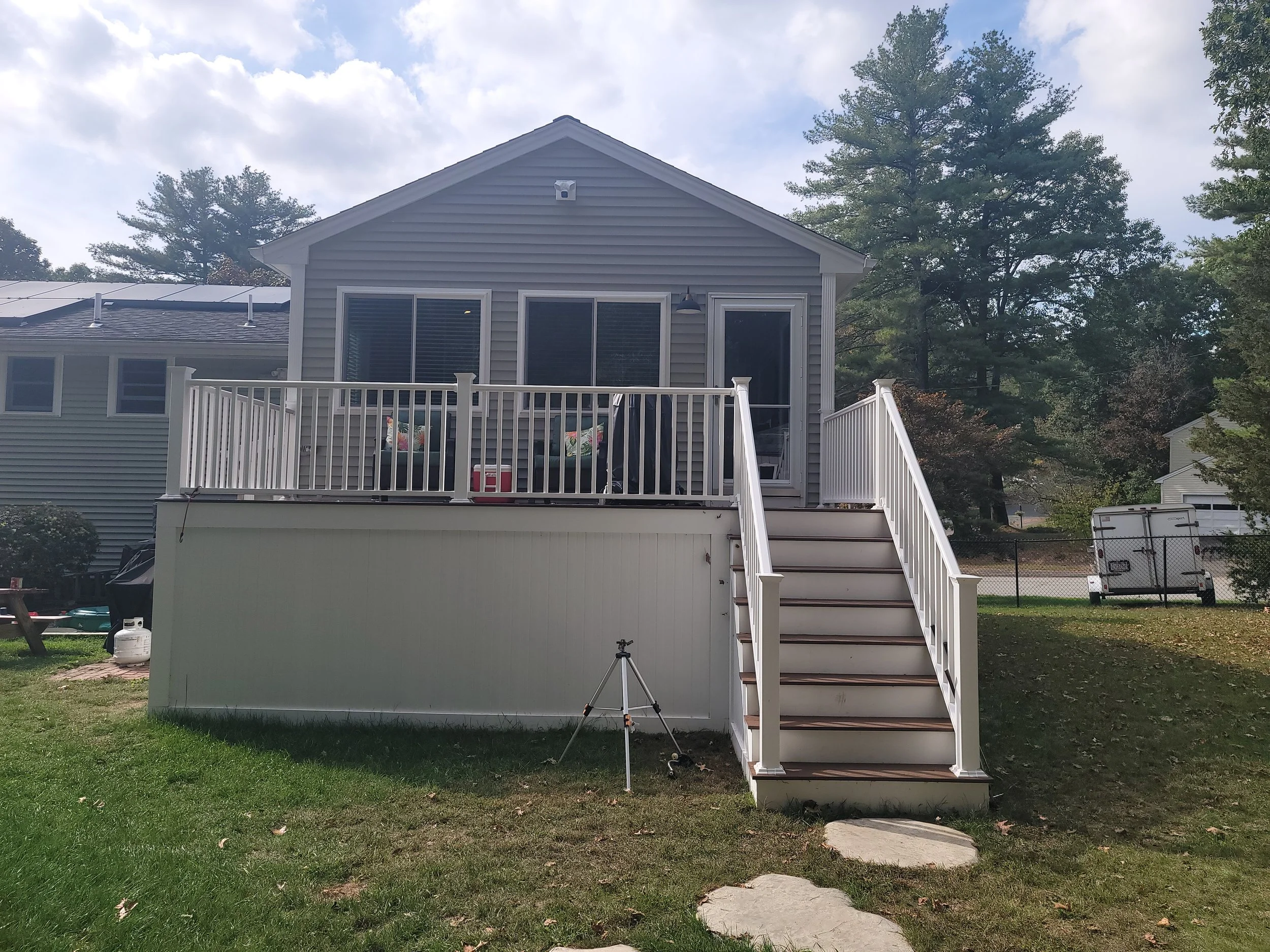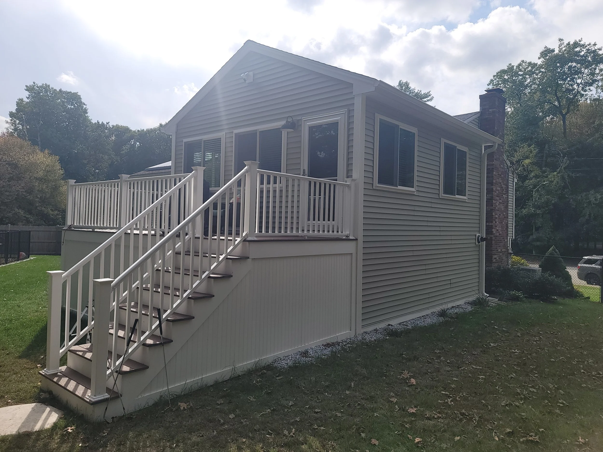 We removed the old deck and sunroom, setting up temporary fencing throughout the project for safety and convenience. The new family room addition integrates perfectly with the rest of the home, featuring a 36 x 80-inch Provia full-view exterior door with a storm door, offering easy access to a new 16 x 8-foot composite deck. The family room is bathed in natural light from five 60 x 50-inch sliding windows, all energy-efficient with UV protection. The vaulted ceiling enhances the room’s spacious feel, while the doghouse basement entrance was redesigned with a new shed-style roof to match the home’s existing roofline. A set of stairs from the deck allows for easy indoor-outdoor flow, and the deck is securely built using Techno Metal Post footings for added stability.