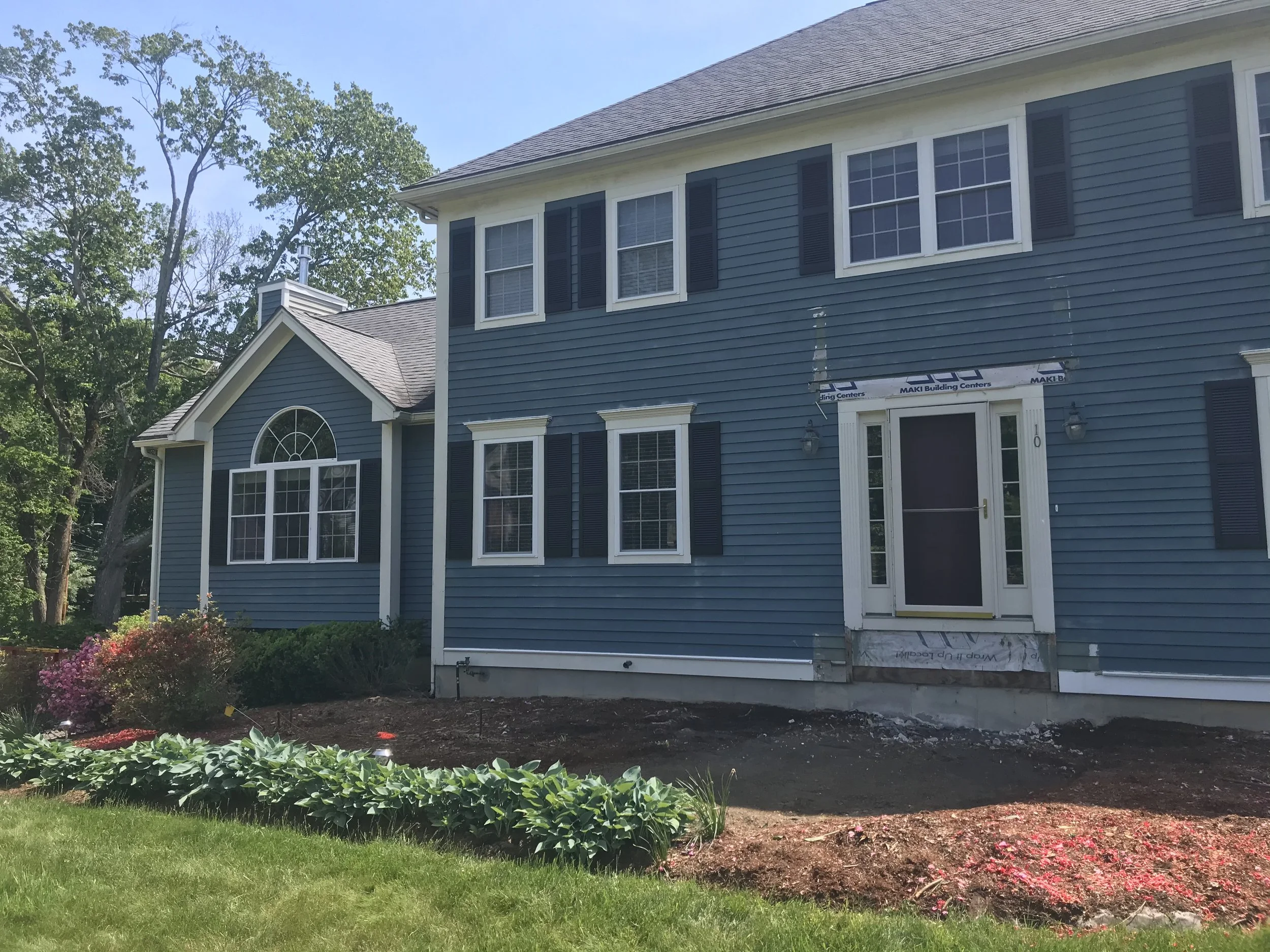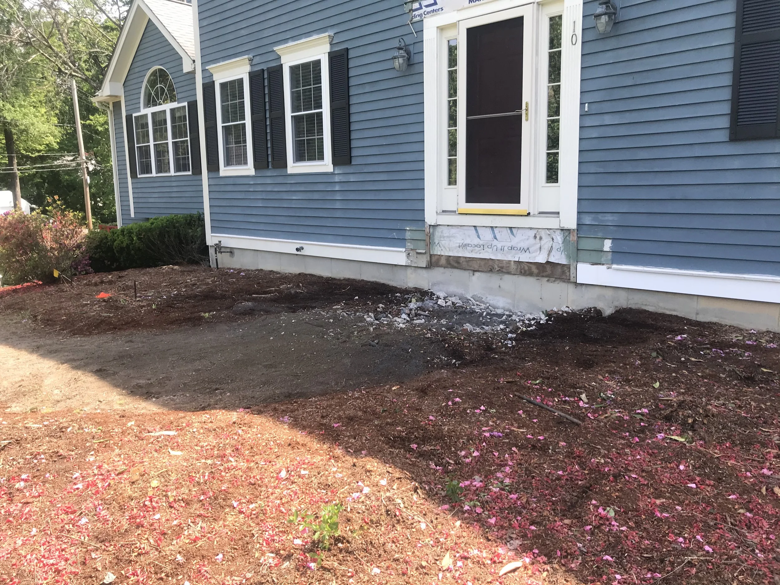 Wide-angle of the completed front elevation with porch, storm door, and new walkway