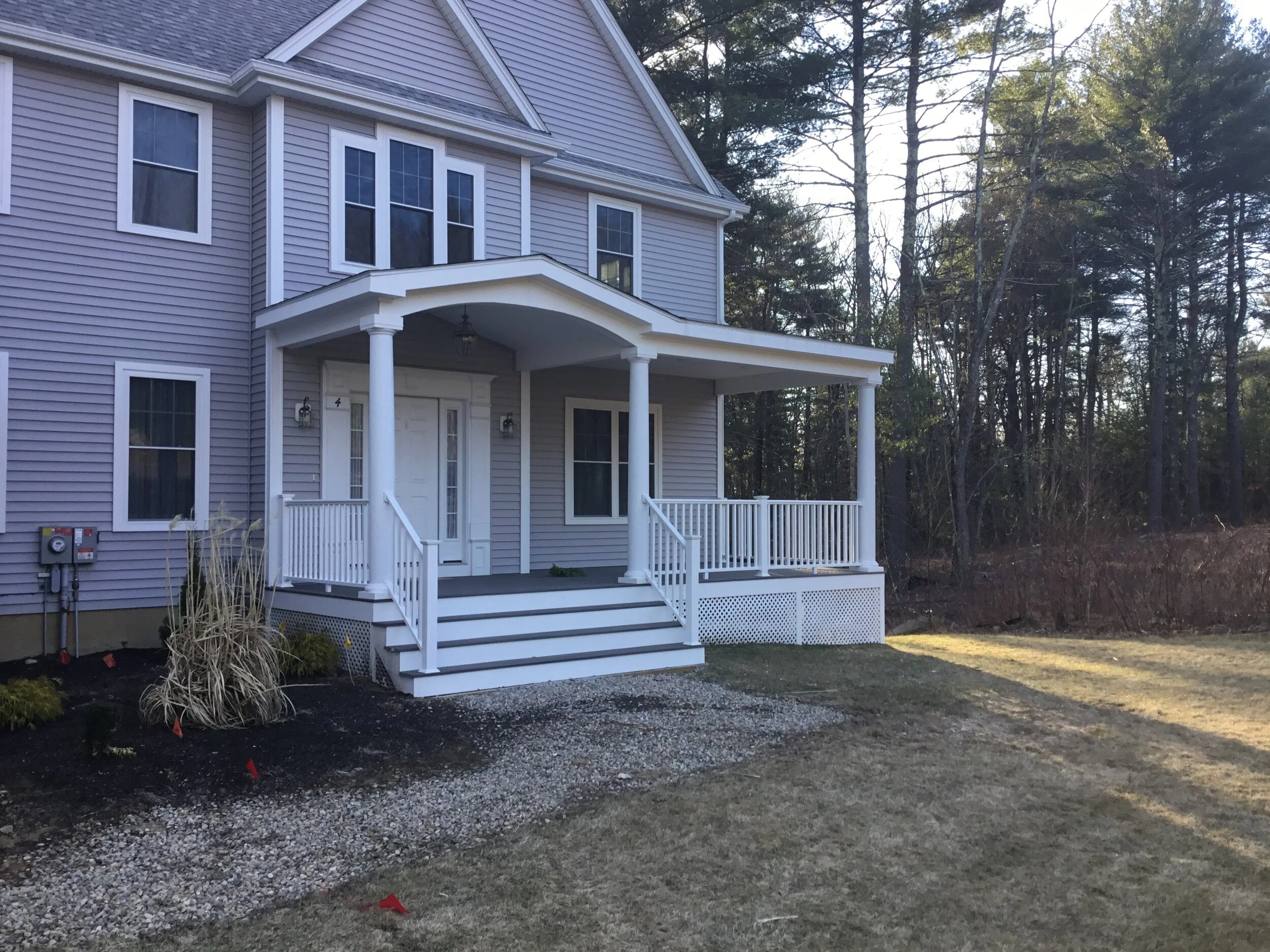 Front view of the new covered porch addition in Upton, MA, featuring wide staircase, PVC lattice skirt, and RDI Titan Pro railings for durability and curb appeal.