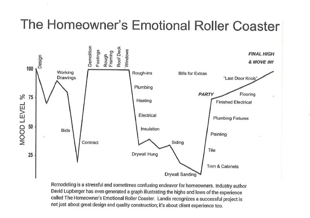 Our average basement project remodel timeframe from the signed “final” contract, (this is after the design process) is approximately 16 weeks to completion. The design process and what has been chosen to do with your basement can take some time as well. Some things that may make the project longer than the 16 weeks are “unknowns” and change orders. All existing new remodels must be built to today’s building codes and opening existing walls can have unknowns behind them. I have added the famous emotional roller coaster remodeling project page here. 😊 Most of our customers find this extremely helpful during a remodel.