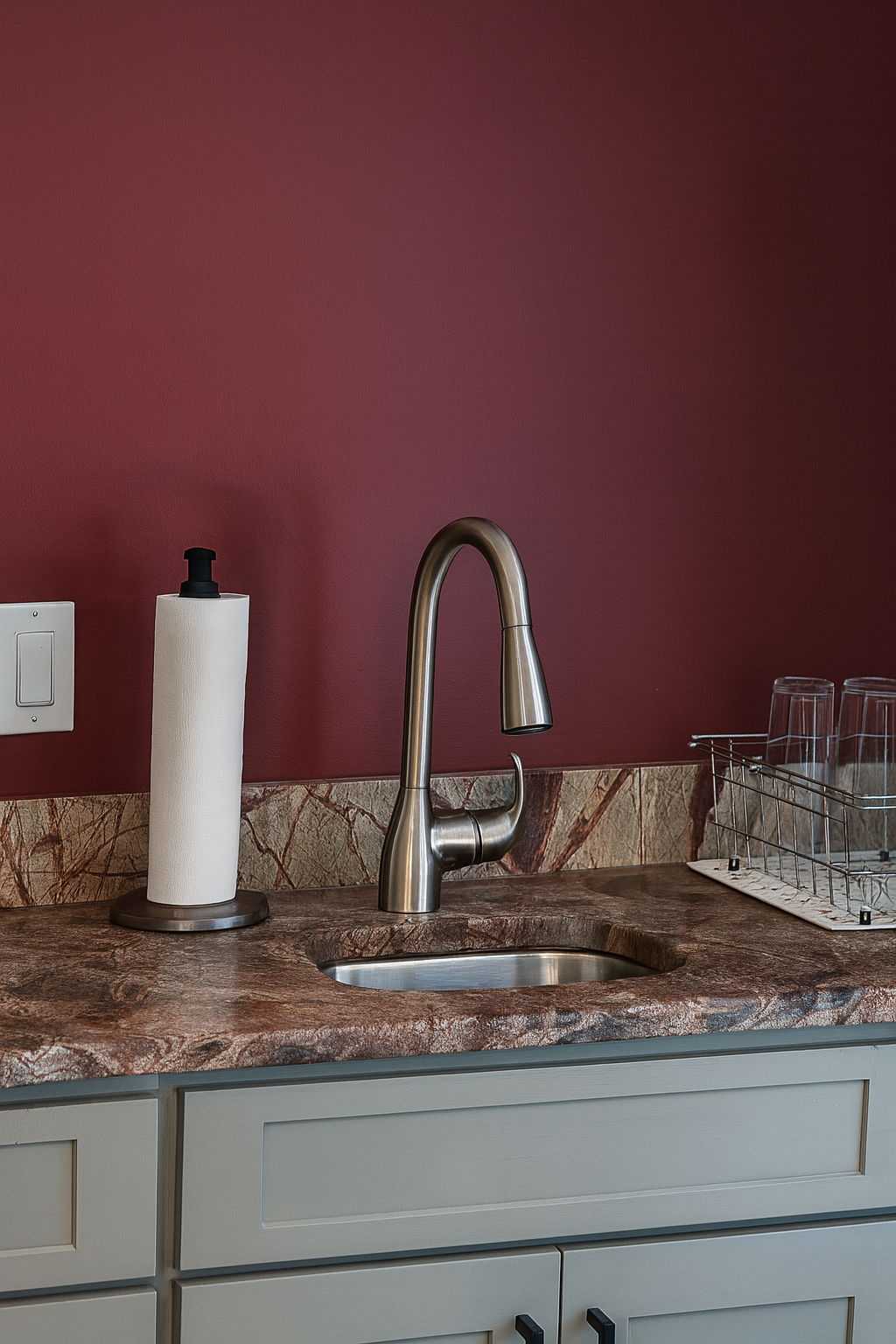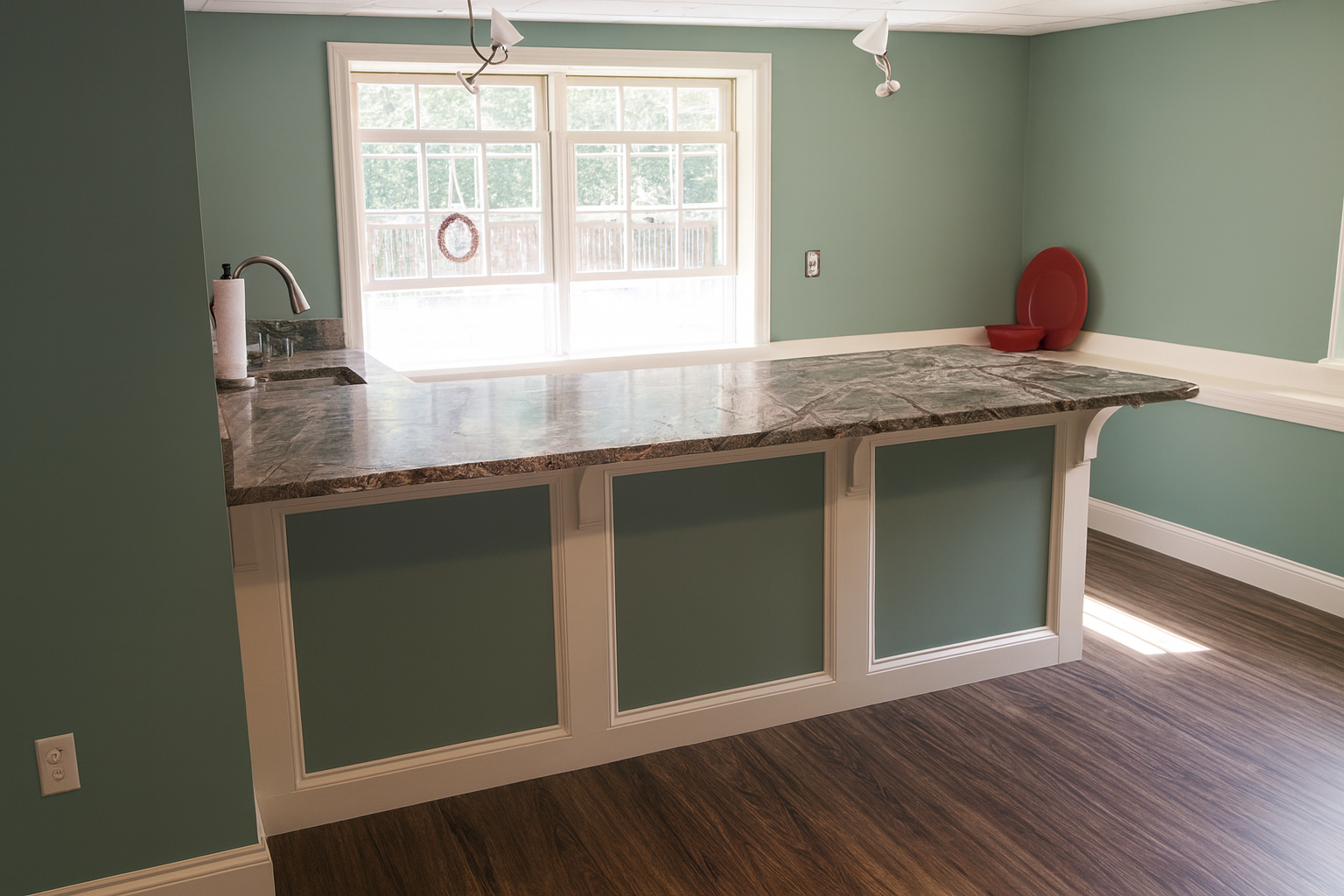 The highlight of this basement is the custom wet bar, featuring luxurious Rainforest Green Granite countertops and custom-painted cabinetry—perfect for entertaining guests or unwinding in style. Throughout the space, we installed Simpleese Driftwood Teak Luxury Vinyl Click Plank Flooring, offering the perfect balance of warmth, durability, and low maintenance.