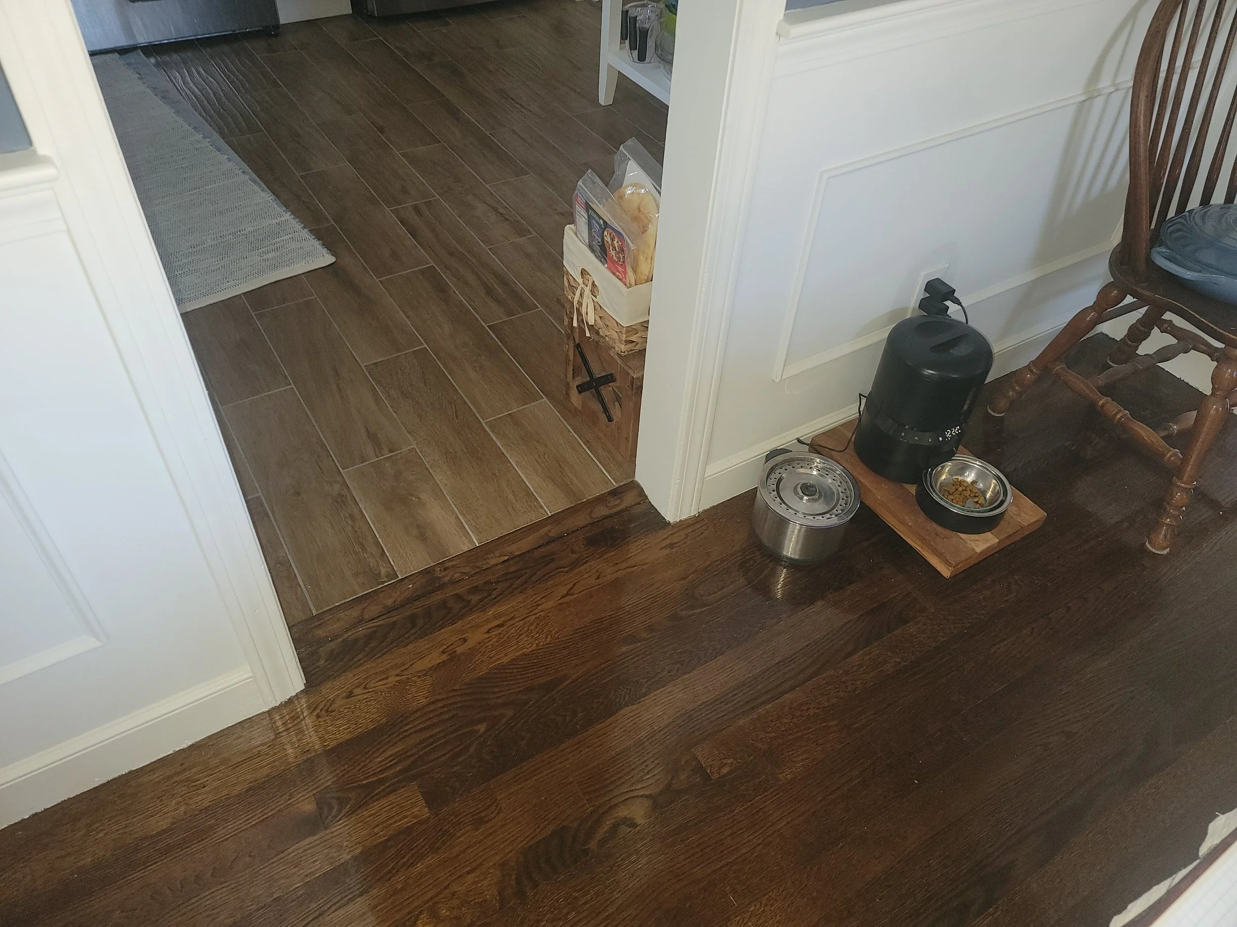 The renovation began with careful protection of adjacent rooms, followed by a full remove-and-refresh of the existing cabinets, counters, and backsplash. We framed and insulated the former porch door opening, widened the passage to the dining room for better flow, installed a new half-glass entry door, and properly vented the range hood through the exterior. Because the basement is finished, new wiring was routed via exterior PVC and the attic; we updated switching, added AFCI-protected circuits for the dishwasher and countertop outlets, installed a new pendant and center light, added general-use outlets, patched drywall to a cabinet-ready finish, completed trim and crown, and painted. Plumbing updates included connecting the new sink drain, reinstalling the faucet, and adding a glass rinser. The existing tile floor was protected and retained for a seamless transition.