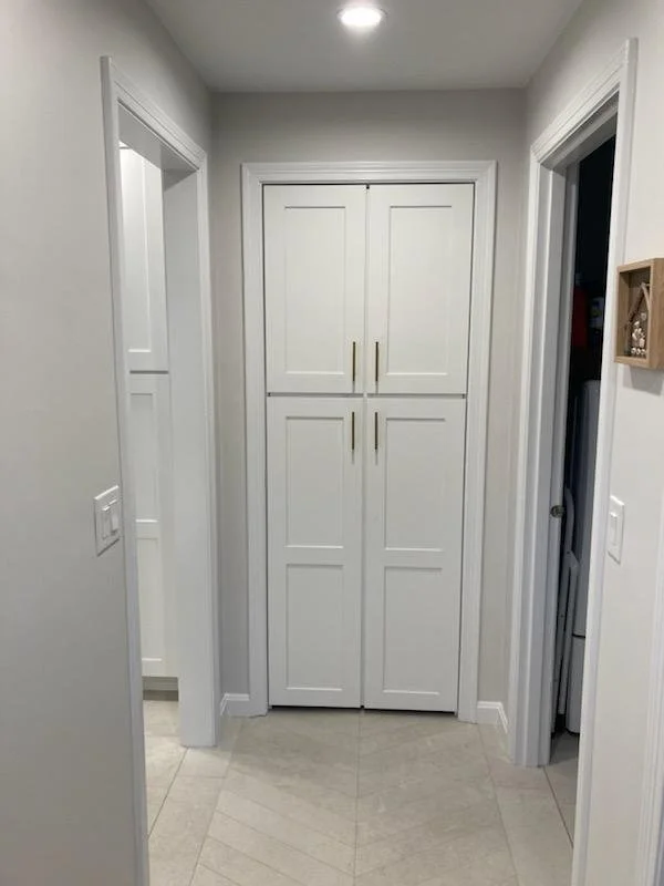 The laundry room was upgraded with custom-built shelving and new closet doors to significantly improve organization and day-to-day function. The refreshed layout keeps essentials accessible and creates a tidy, efficient workspace for household tasks.