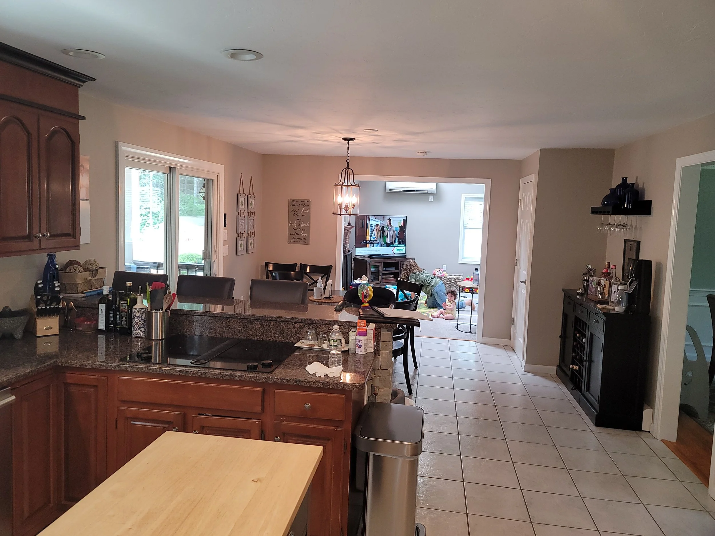 Open-concept kitchen remodel featuring a structural support beam, seamlessly connecting the kitchen and dining area for a brighter, more spacious feel.