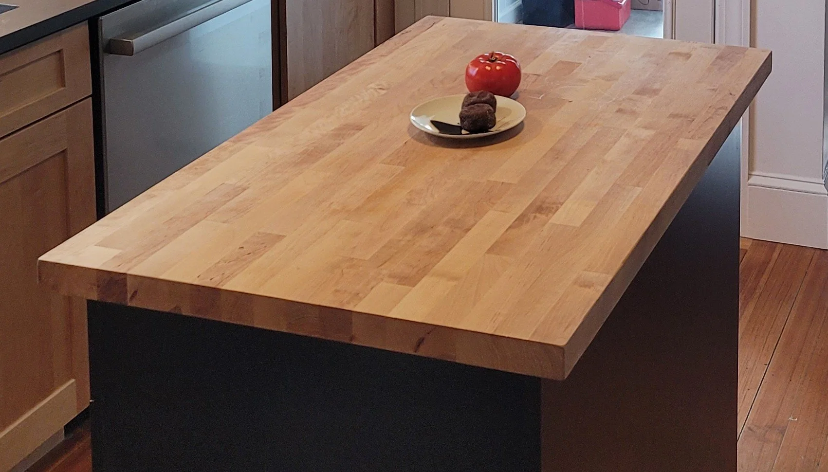 Kitchen with butcher block island with Waypoint 650F Painted Black cabinets.