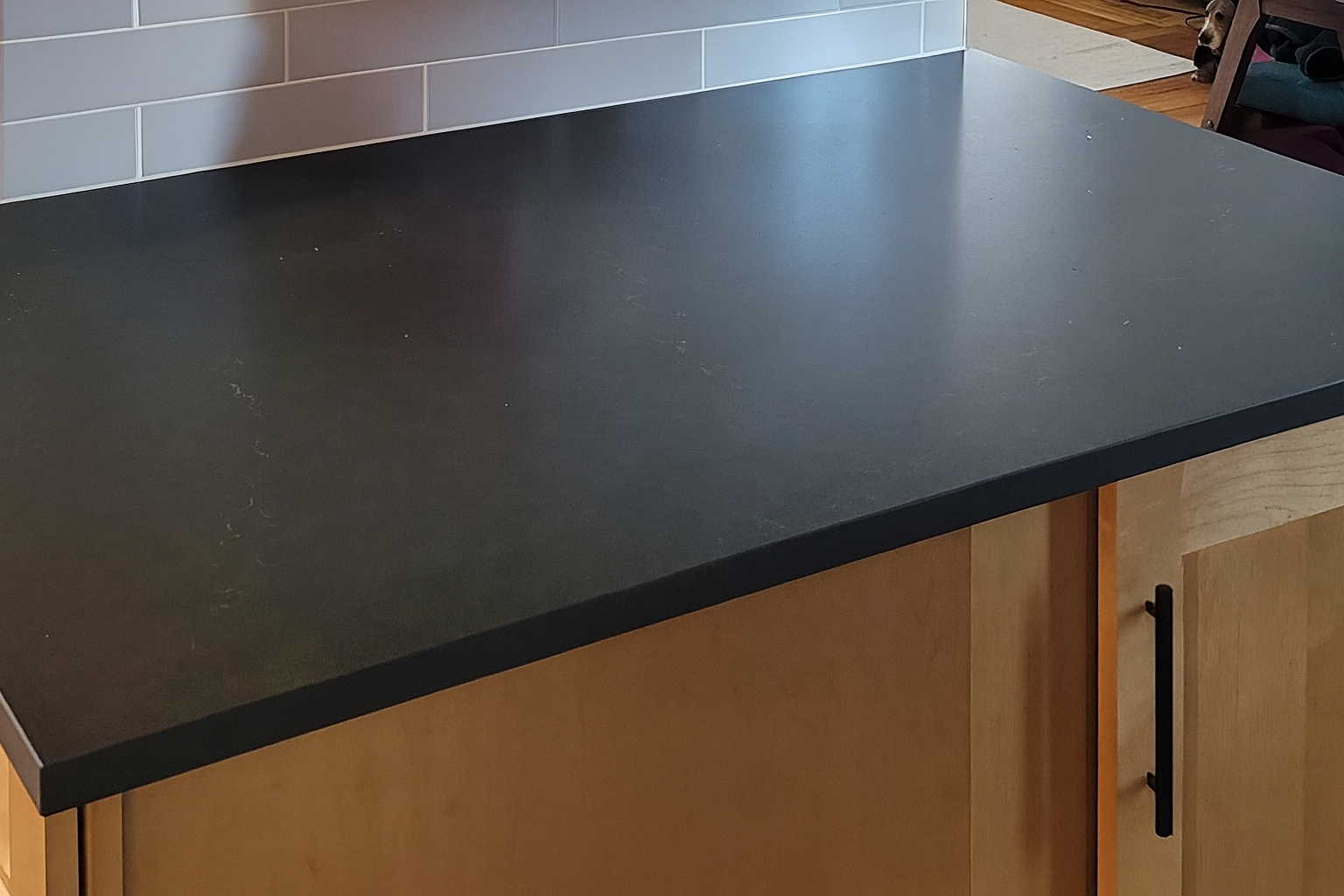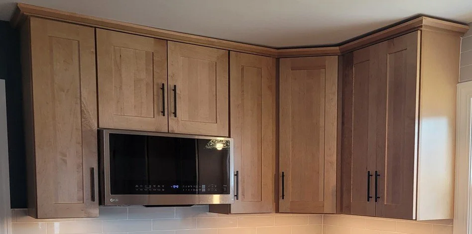 For the cabinetry, we selected Waypoint 650F Maple Rye for the main kitchen cabinets, which feature a warm, natural wood finish. These cabinets are paired with Silestone Charcoal Soapstone countertops, bringing a sophisticated and durable surface to the space. The kitchen island was designed with a contrasting look, using Waypoint 650F Painted Black cabinets and a butcher block countertop, which adds texture and character. The island also features iron supports for a sleek, industrial touch.
