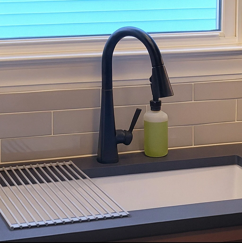 To enhance the kitchen’s functionality, we chose a Blanco Diamond 33-1/2" Undermount Single Basin SILGRANIT sink, known for its durability and easy maintenance. Paired with the sink is a Delta Lenta Pull-Down Kitchen Faucet, which features Touch Activation, Magnetic Docking Spray Head, and Shield Spray technology, providing both convenience and advanced functionality.