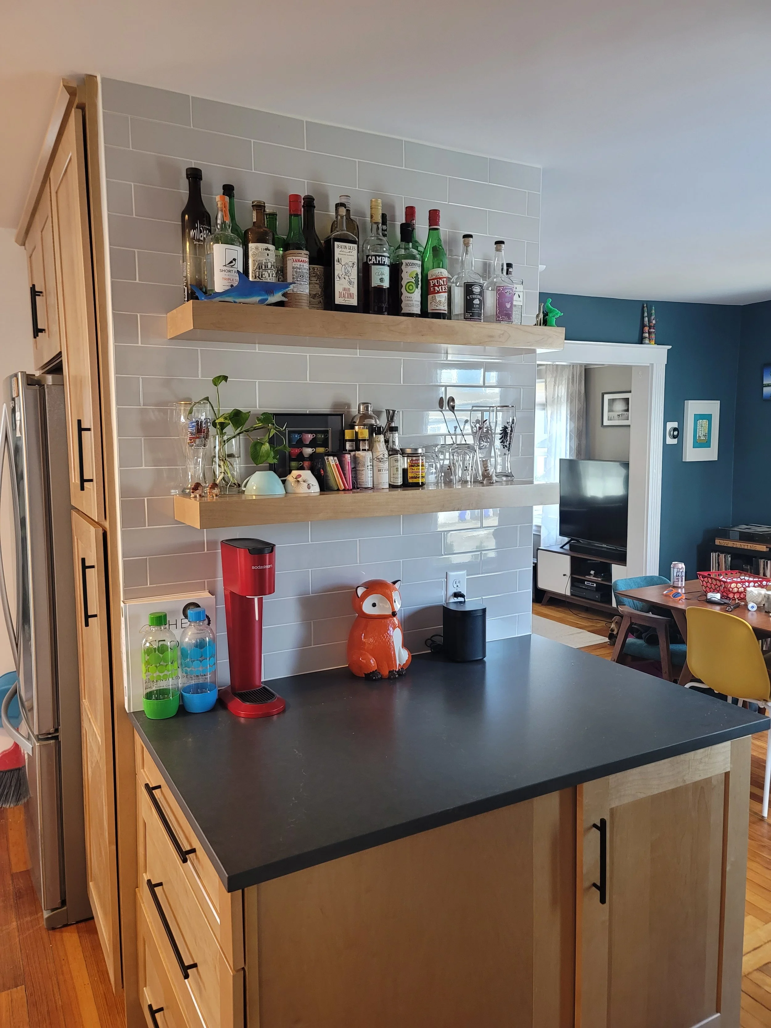 floating shelves with the backsplash we installed in Villa Seaside ceramic tile by Floor and Décor