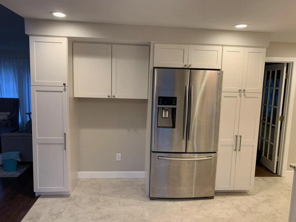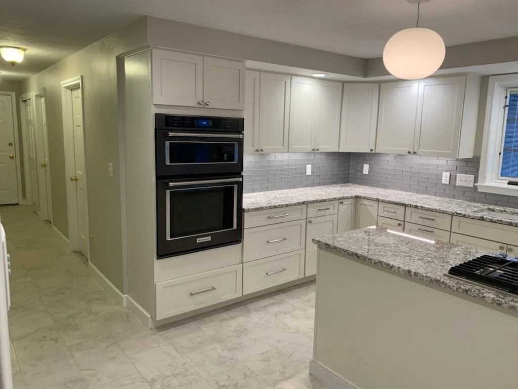 This kitchen renovation involved a full demo of the original kitchen, including the removal of all cabinetry and tile flooring. We transformed the space with the installation of WOLF Designer Cabinetry, featuring elegant Concord Shaker-style doors with a Divinity paint finish. The five-piece door fronts, crafted with all-plywood construction, not only provide lasting durability but also bring a classic, timeless look to the kitchen. The cabinets are equipped with soft-close doors and drawers for smooth and quiet operation, enhancing the overall functionality of the space. To maximize storage, we added several custom features, including a silverware drawer, a double trash roll-out, roll-out shelves in the pantry cabinet, and a convenient spice pull-out, making the kitchen as practical as it is stylish.