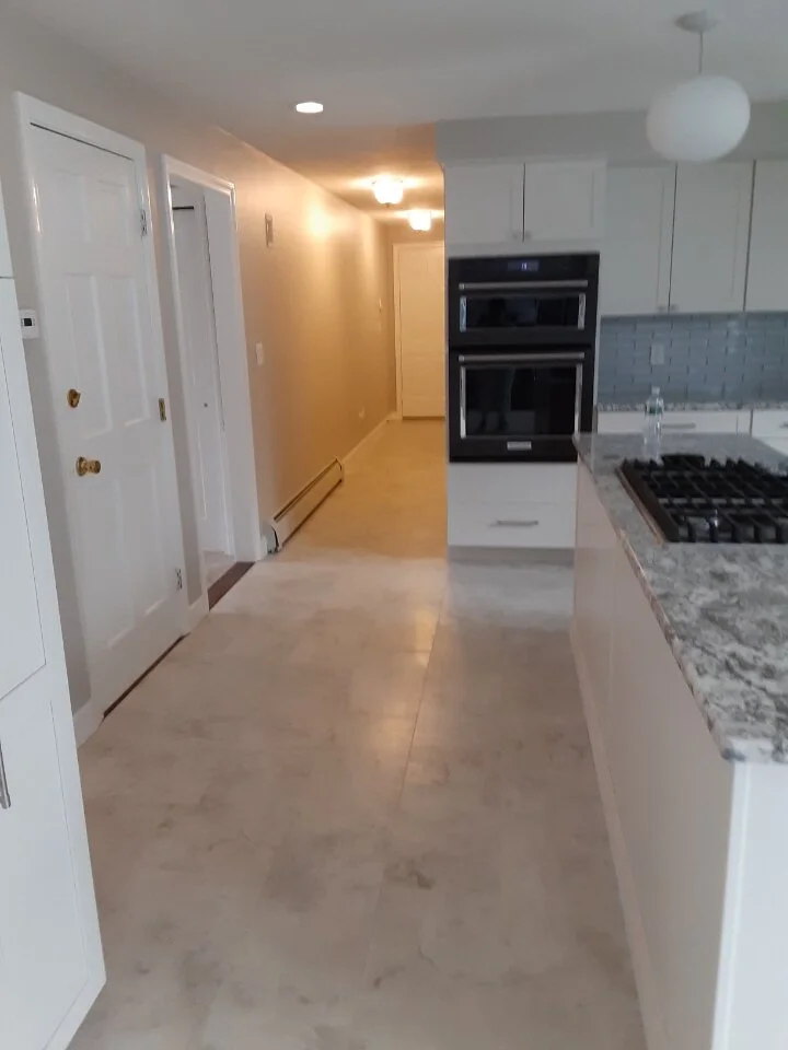 The new flooring throughout the kitchen and connecting hallway is Temple Stones Ephesus Porcelain Tile, known for its durability and natural stone-like appearance. The tiles are laid with Spectralock #90 Light Pewter grout, providing a seamless, clean look that complements the overall color scheme of the kitchen. This porcelain flooring offers a durable, low-maintenance solution, perfect for high-traffic areas.