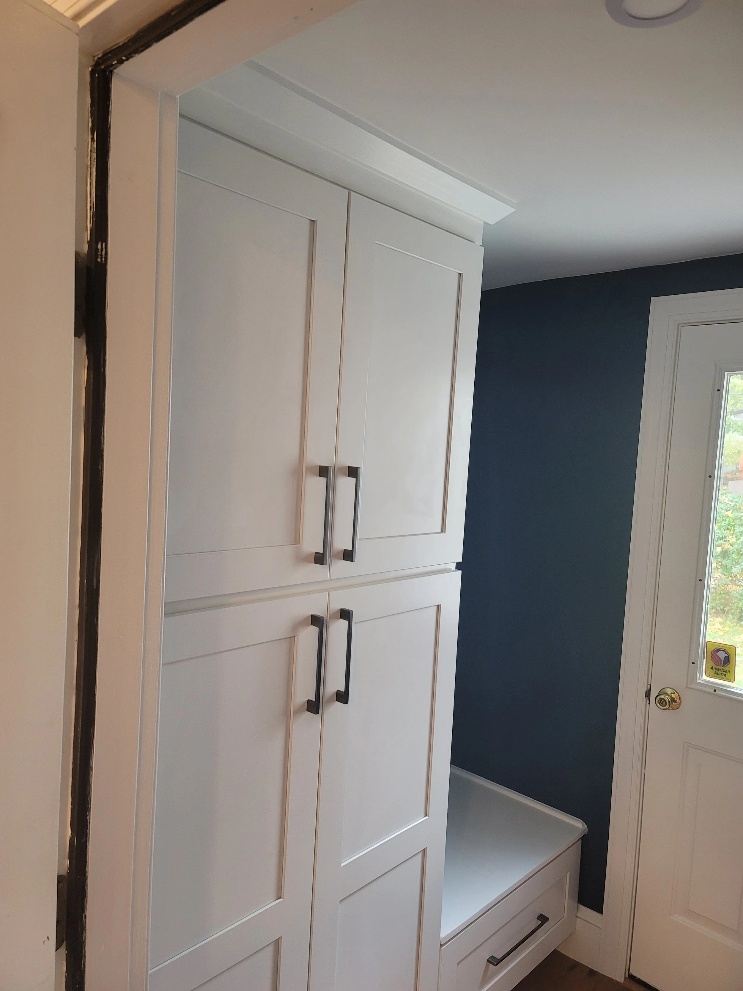 This kitchen remodel showcases a blend of modern elegance and functional design. The kitchen and pantry cabinets feature the sleek 650F Painted Linen style from Waypoint, accented with brushed pewter Sutton hardware from Hardware Resources, giving the space a bright and refined look. The countertops are crafted from durable Dekton Laos 3cm, featuring a Cosentino leather finish and pencil edge for a sophisticated touch.