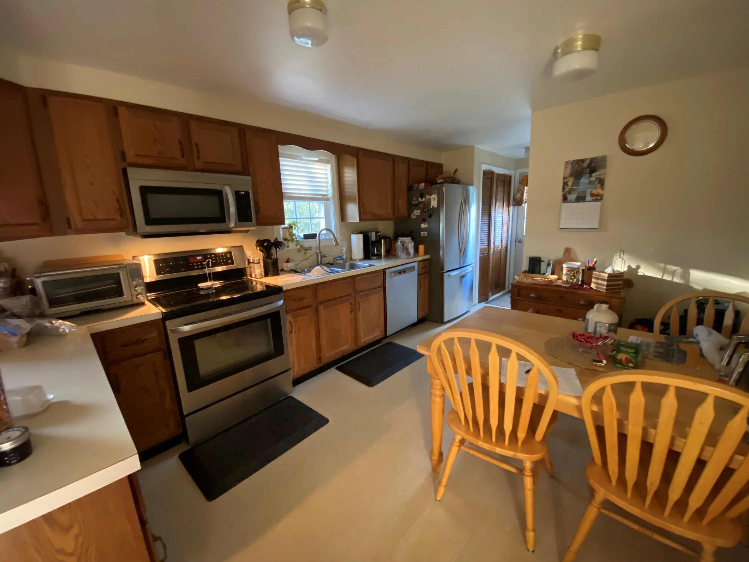 Before Overview of the existing Northbridge kitchen before remodeling, featuring wood cabinets and dated finishes.