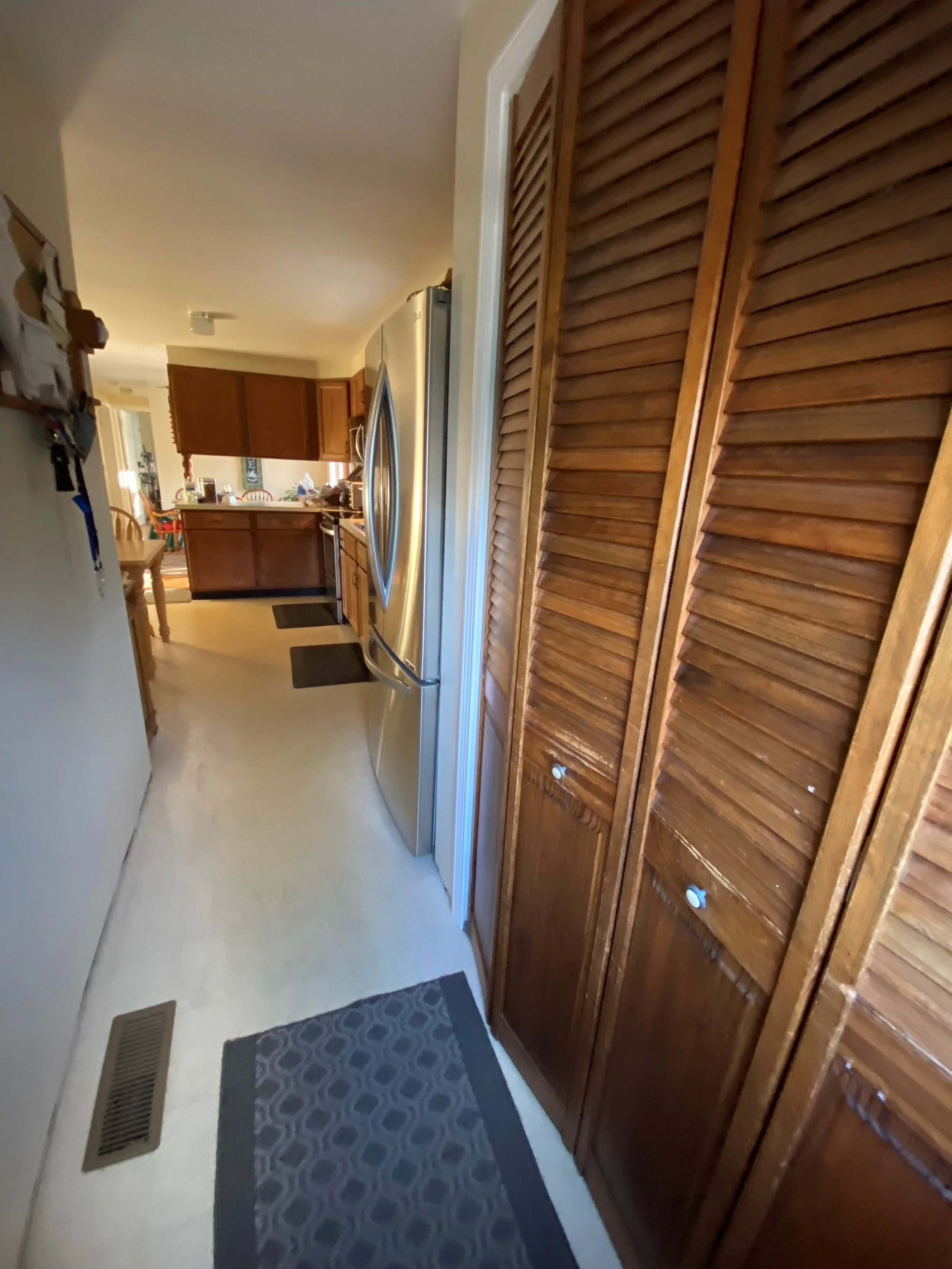 Before Entryway corridor with wood doors and vented flooring before renovation work.