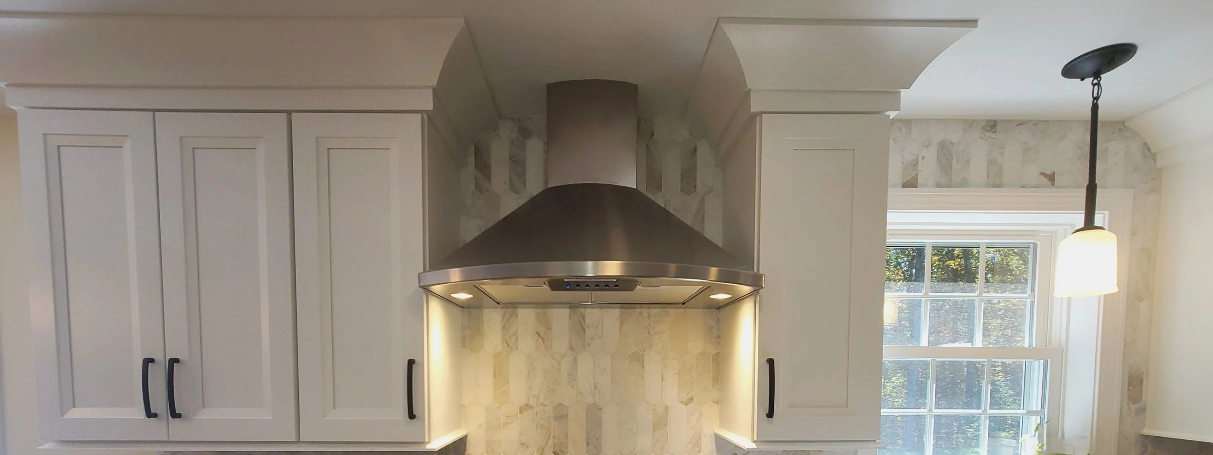 Mosaic marble picket tiles create a timeless backsplash design, beautifully complemented by a sleek stainless steel range hood in this Northbridge, MA kitchen remodel by CORE Remodeling Services, Inc.